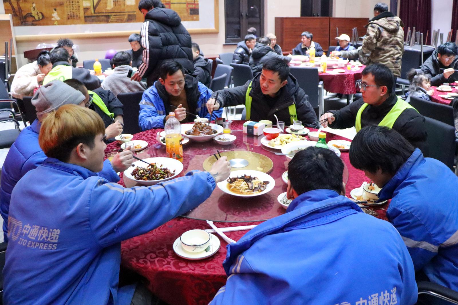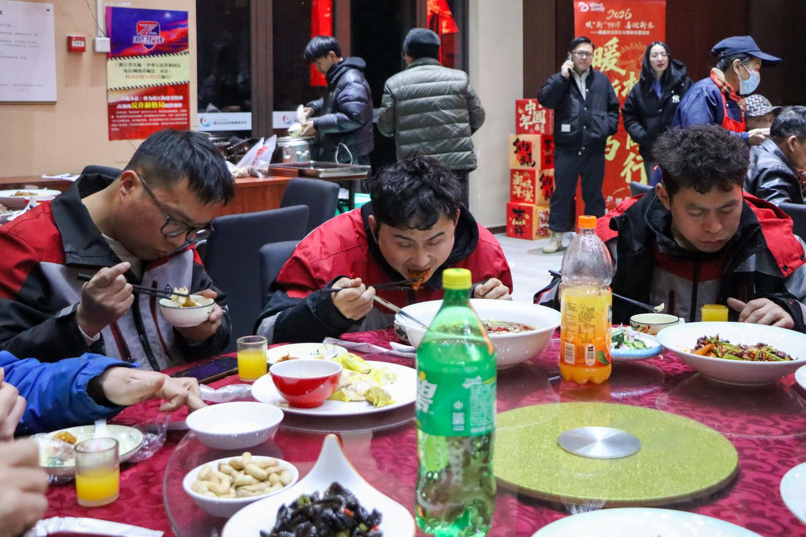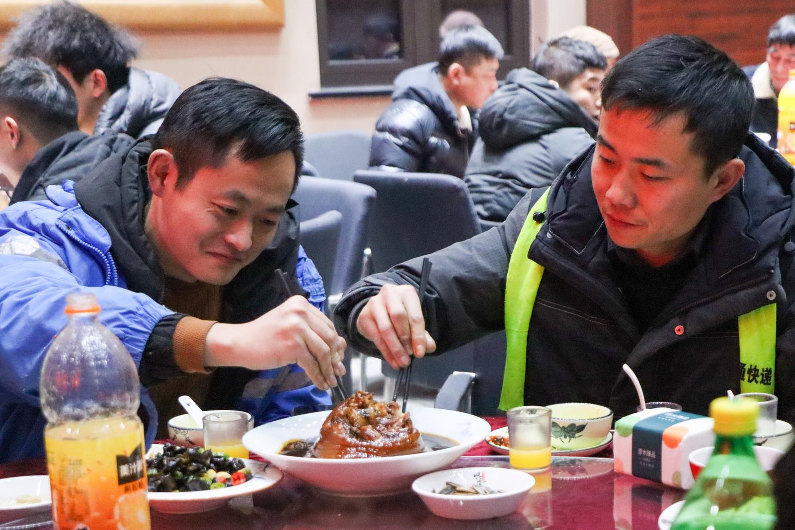 夜幕降临,馒头山社区大礼堂灯火璀璨、香气四溢,新春团圆年夜饭温馨开席。酸辣鲜香的酸菜鱼、浓香软烂的酱汁牛肋骨、绵密咸香的葱油芋艿……一道道热气腾腾的家常菜,承载着温情与年的味道。新就业群体们围坐一堂,卸下一天的奔波疲惫,与大家热烈攀谈着,有人分享着一年来的打拼收获,有人畅谈着对新年的美好期许。“街道的年夜饭,让我们这些在外奔波的人,也妥妥过上了团圆年!”中通快递城南一部负责人说道。