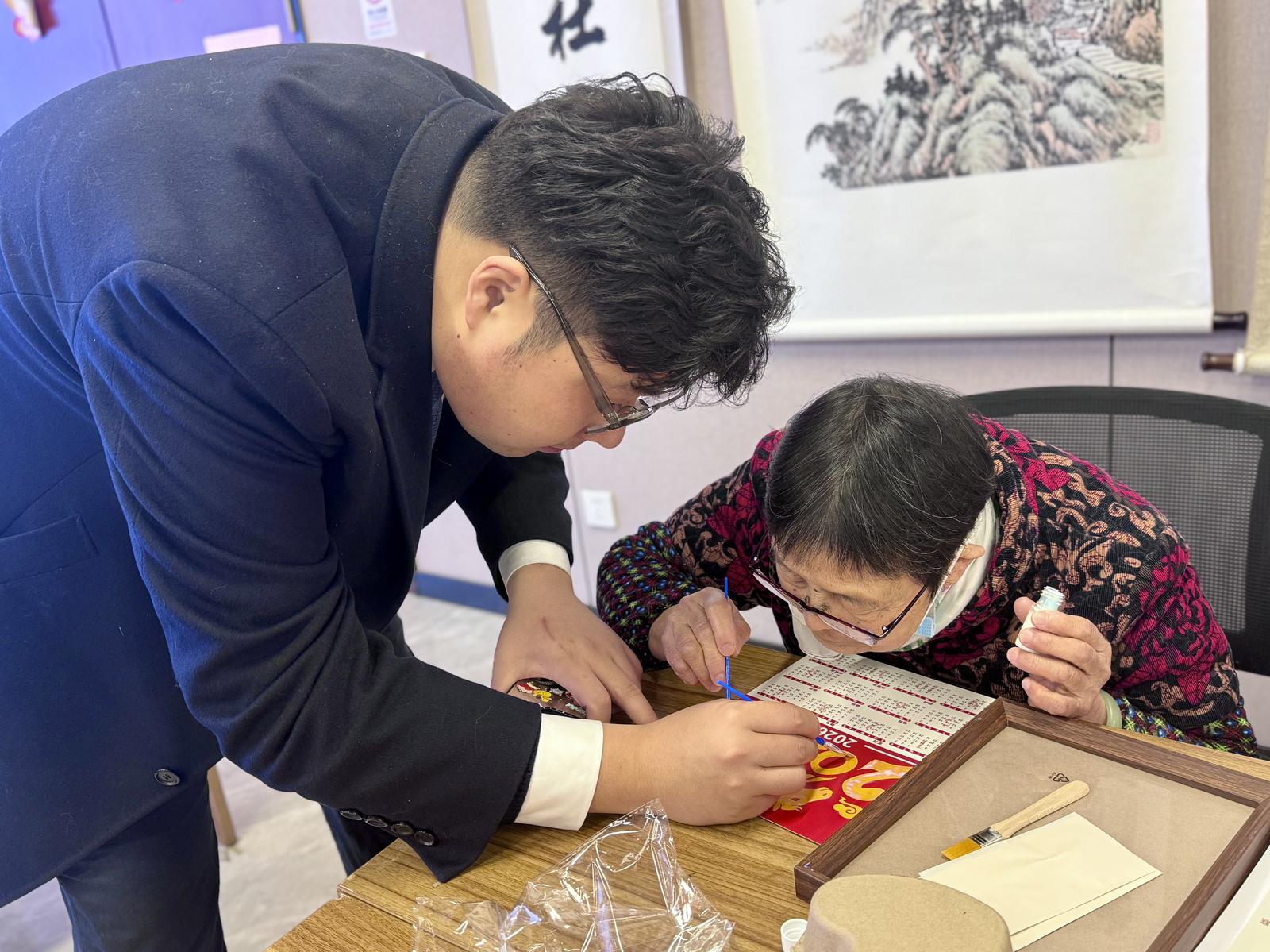老人们神情专注,小心翼翼地将金箔纸覆盖在“福”字与马年纹样上,用指尖轻压抚平,再轻轻扫去多余金箔,金色的光泽在红色底板上缓缓晕开,勾勒出吉祥的寓意。遇到操作难题时,志愿者和工作人员及时上前协助,手把手教大家控制胶水用量、掌握金箔贴合技巧,现场互动温馨热烈。经过一番创作,一幅幅独一无二的金箔新春日历新鲜出炉,红色的底色搭配璀璨的金箔,喜庆又精致。