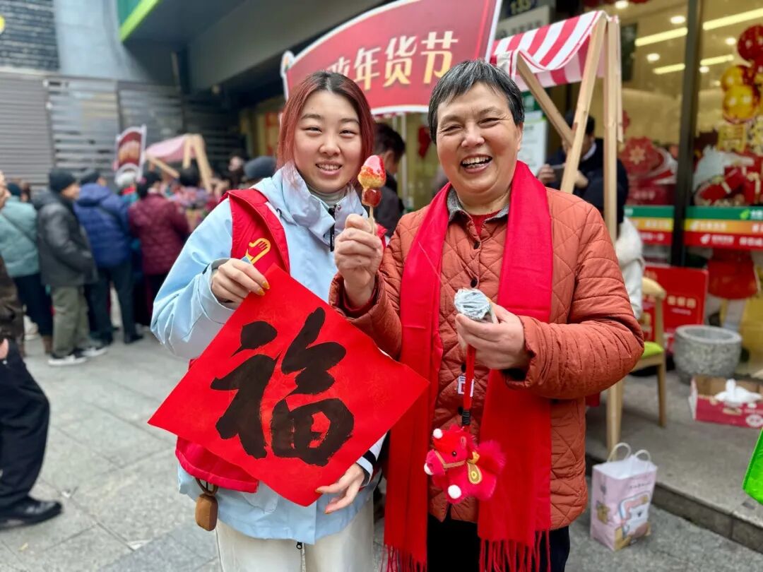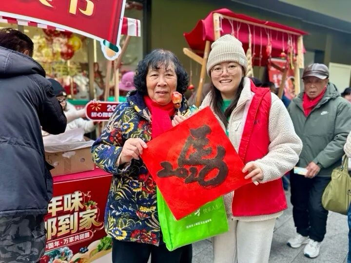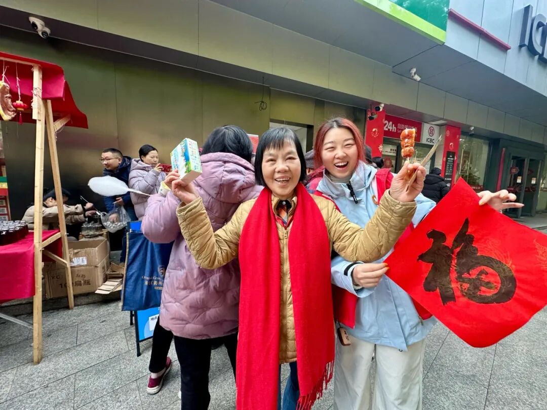 各个摊位前都围满了长者,他们小心翼翼地参与体验,重拾旧时生活的喜悦。糖葫芦摊前欢声笑语不断,许久未尝的酸甜滋味,让老人们仿佛重回儿时街巷;写福字摊位上,红纸铺展、墨香袅袅,银龄志愿者握笔虽有颤抖,每一笔却都格外认真;蓬松如云的棉花糖,更是让老人们像孩子般举在手中,细细品尝入口即化的甘甜。
