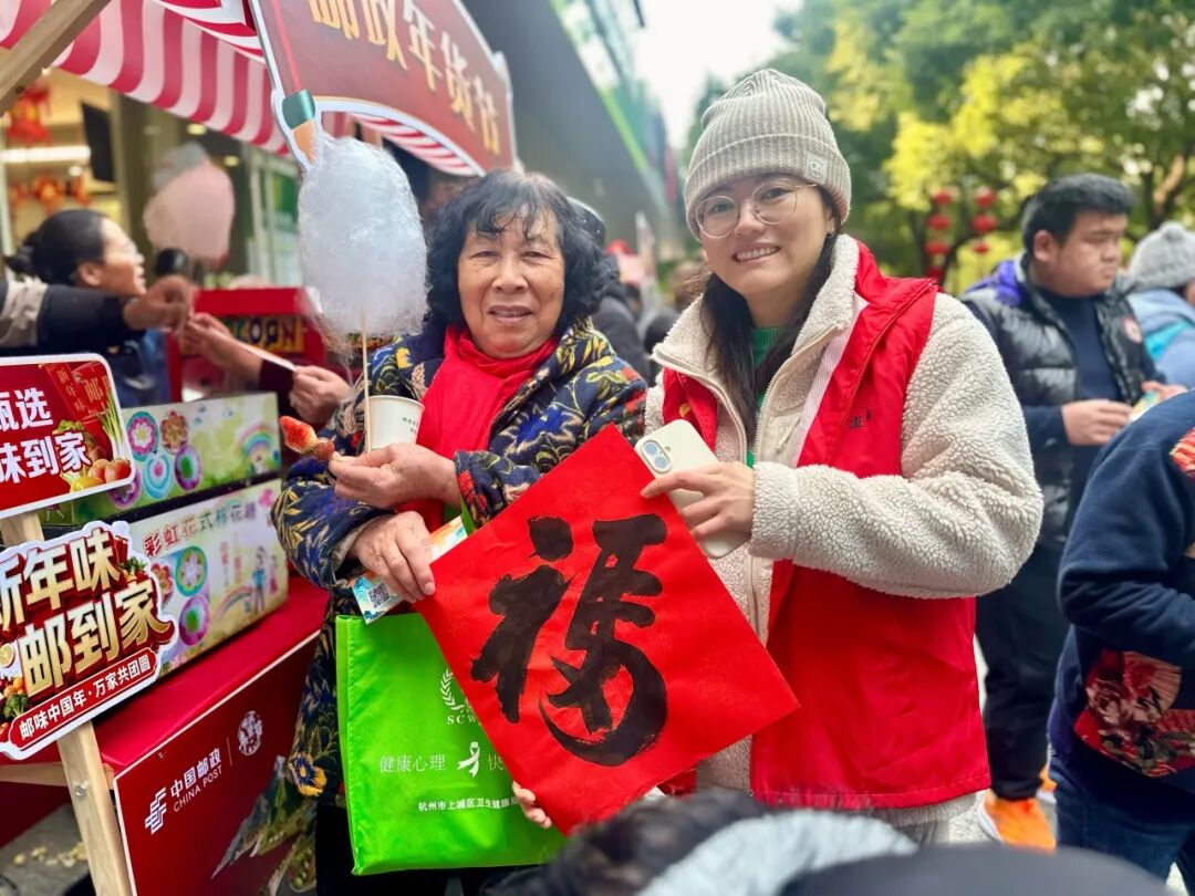上午九点,复兴南街131号逐渐热闹起来。社工提前布置好民俗市集,打年糕、写福字、投壶、棉花糖、红包拓印、打黄酒、糖葫芦串等传统民俗摊位依次铺开,宛如一幅生动的老杭州风情画卷。在专业社工引导和银龄志愿者陪伴下,十余名社区高风险认知障碍长者缓缓步入市集,眼中满是好奇与期待。