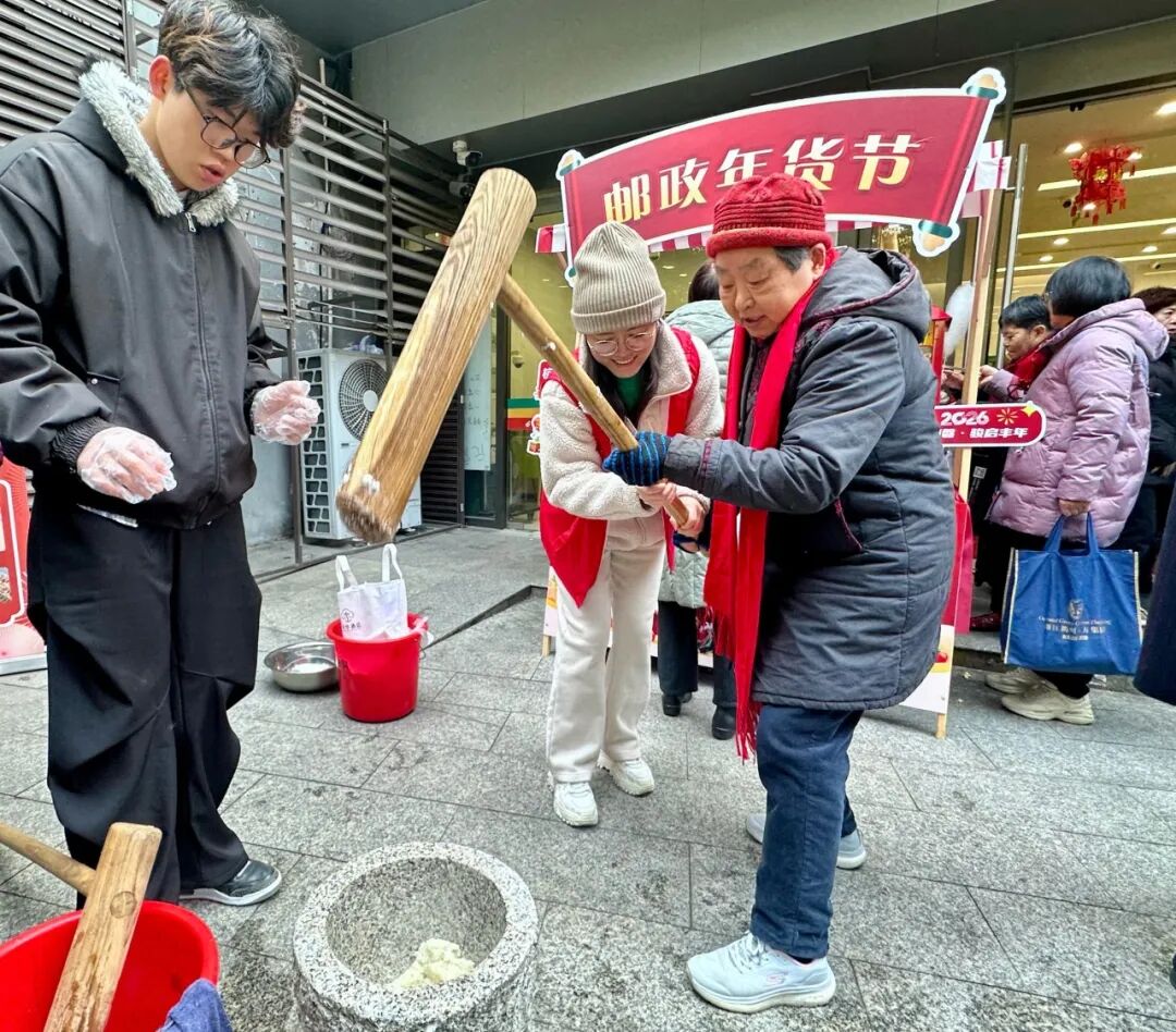 熟悉的民俗场景渐渐唤醒长者记忆深处的温情时光,银龄志愿者一对一陪伴在老人身旁,耐心讲解、轻声交流,协助他们参与各项非遗民俗体验。打年糕摊位前,木槌起落、糯米飘香,一位奶奶在志愿者协助下尝试抡槌,动作虽缓,嘴角却始终挂着笑意,轻声诉说着儿时对热闹场景的期盼。