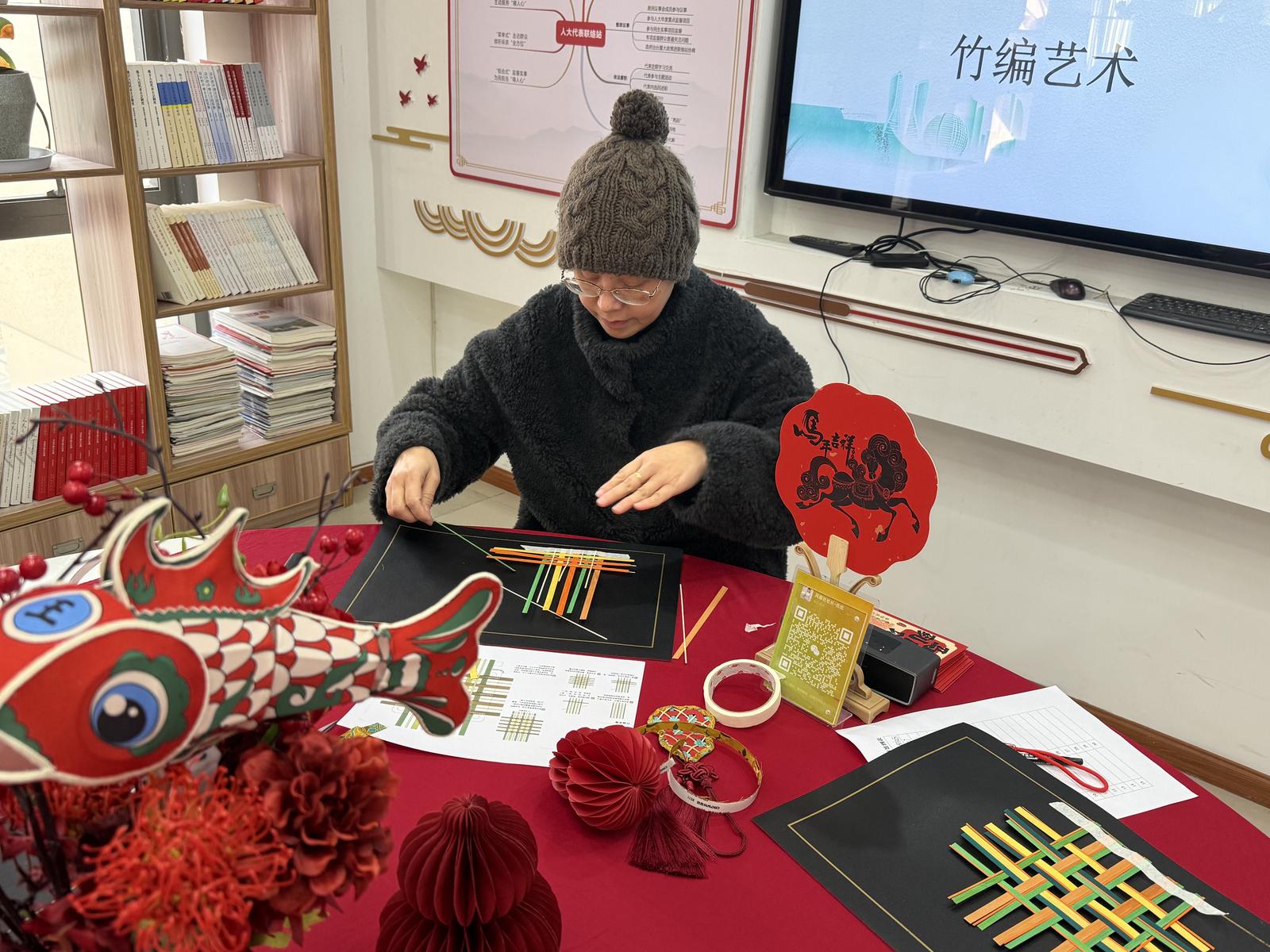 桌上摆满了青黄色的竹篾、红艳艳的中国结,还有红色的流苏。老师先给大家演示:一压一挑,竹篾在指尖穿梭,不一会儿就编出方方正正的底。孩子们看得眼睛发亮,迫不及待地抓起竹篾试起来。