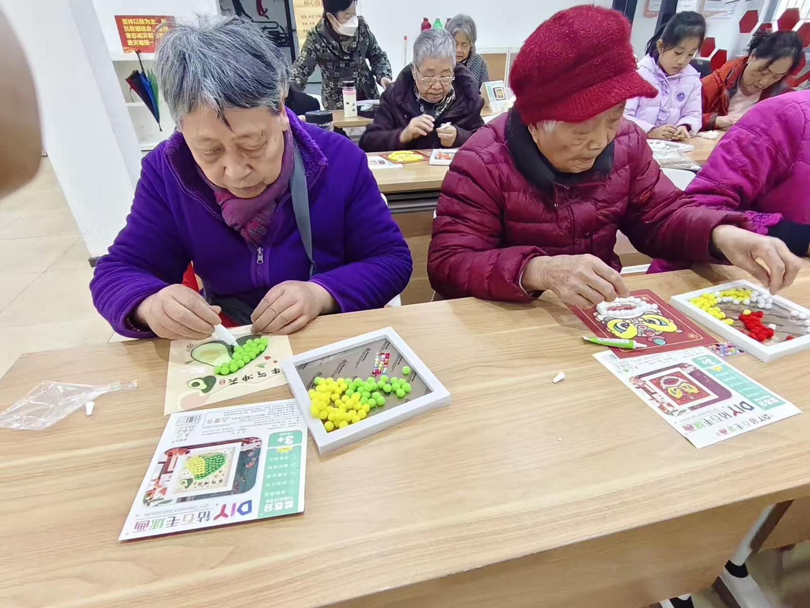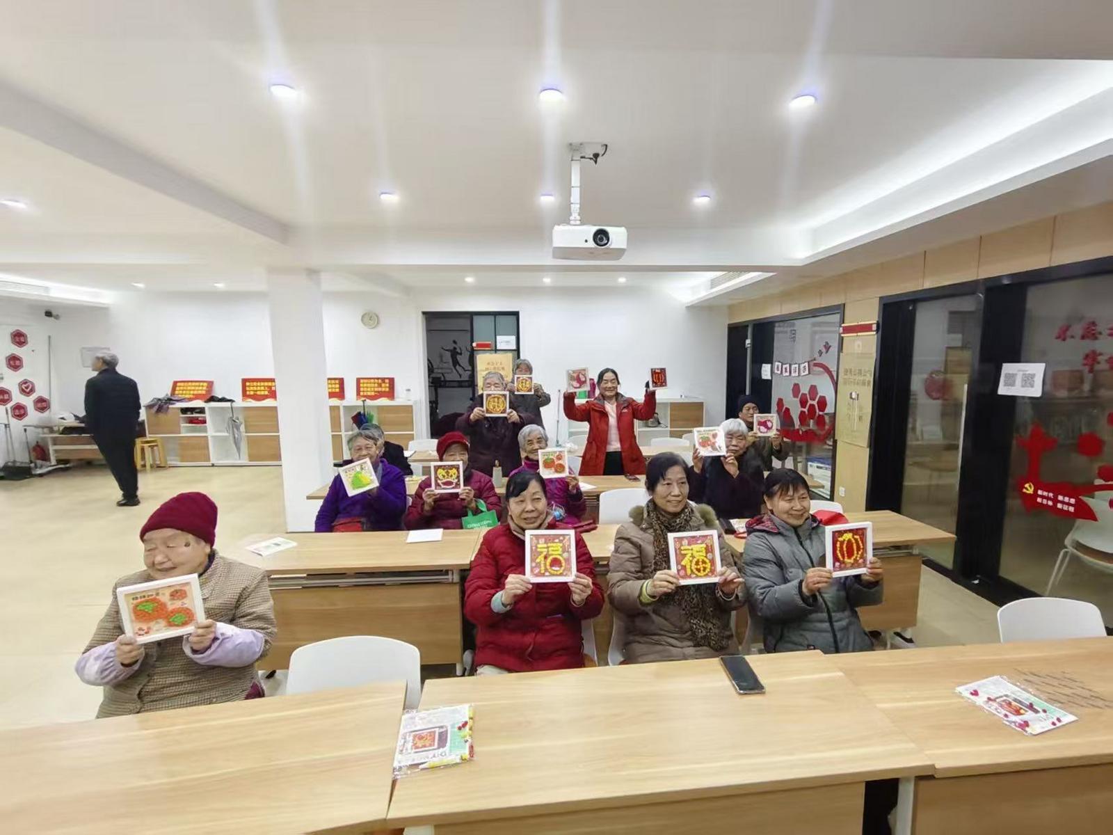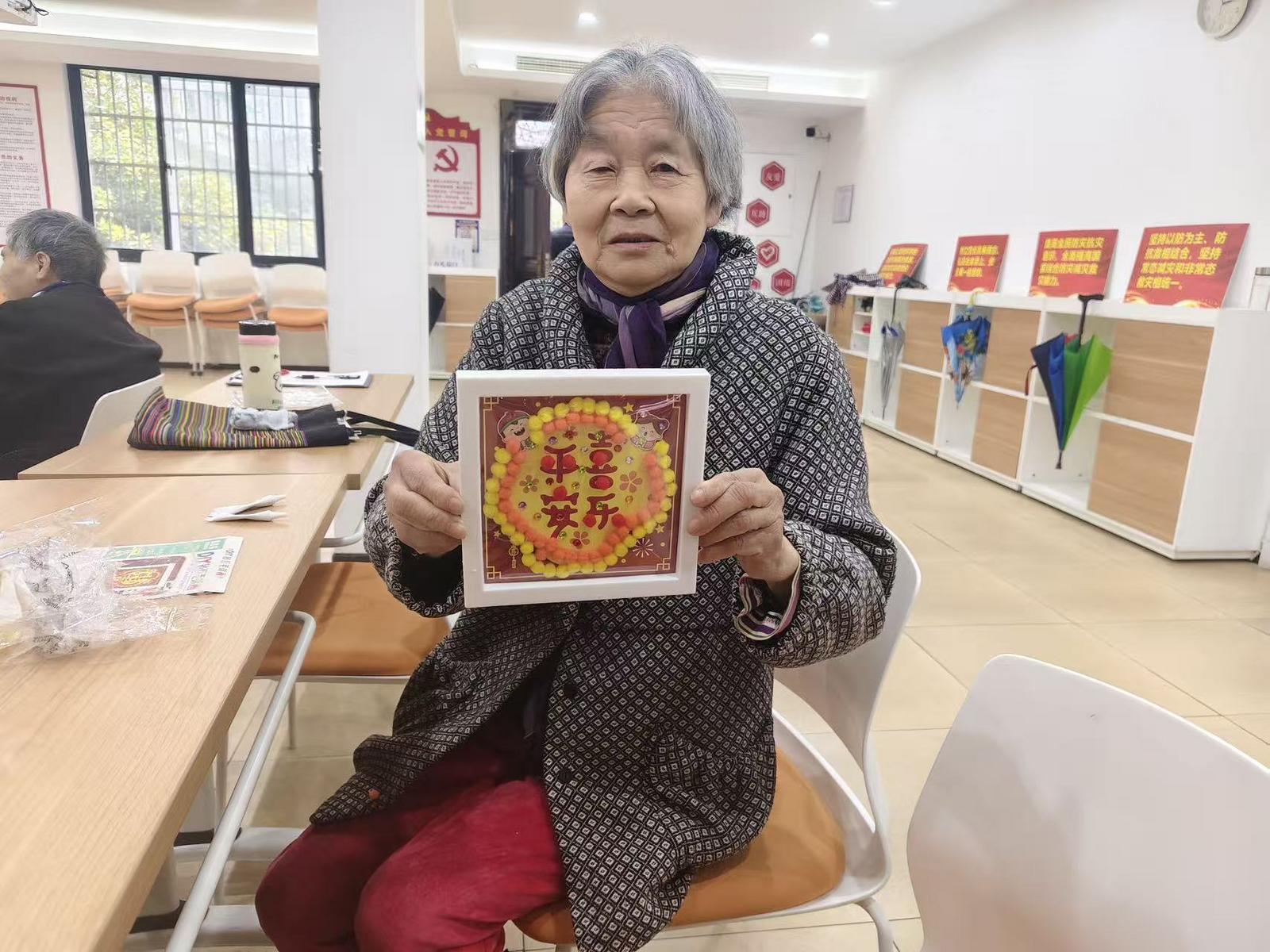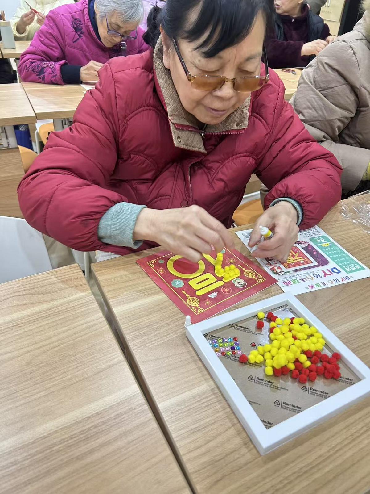 活动现场,工作人员细致讲解制作技巧,老人们听得专注、学得认真。大家将红、黄等色彩的毛球精心粘贴成“福”字与吉祥纹样,再点缀上闪亮的钻石,指尖翻飞间,普通材料化作一幅幅喜庆的相框画。创作间隙,大家互相交流心得、展示作品,活动室里欢声笑语不断,邻里情谊在互动中悄然升温。活动尾声,老人们捧着专属的手工作品,脸上洋溢着满足的笑容。大家纷纷表示,这样的活动既锻炼了动手能力,又让大家在热闹的氛围中感受到了节日的温馨。