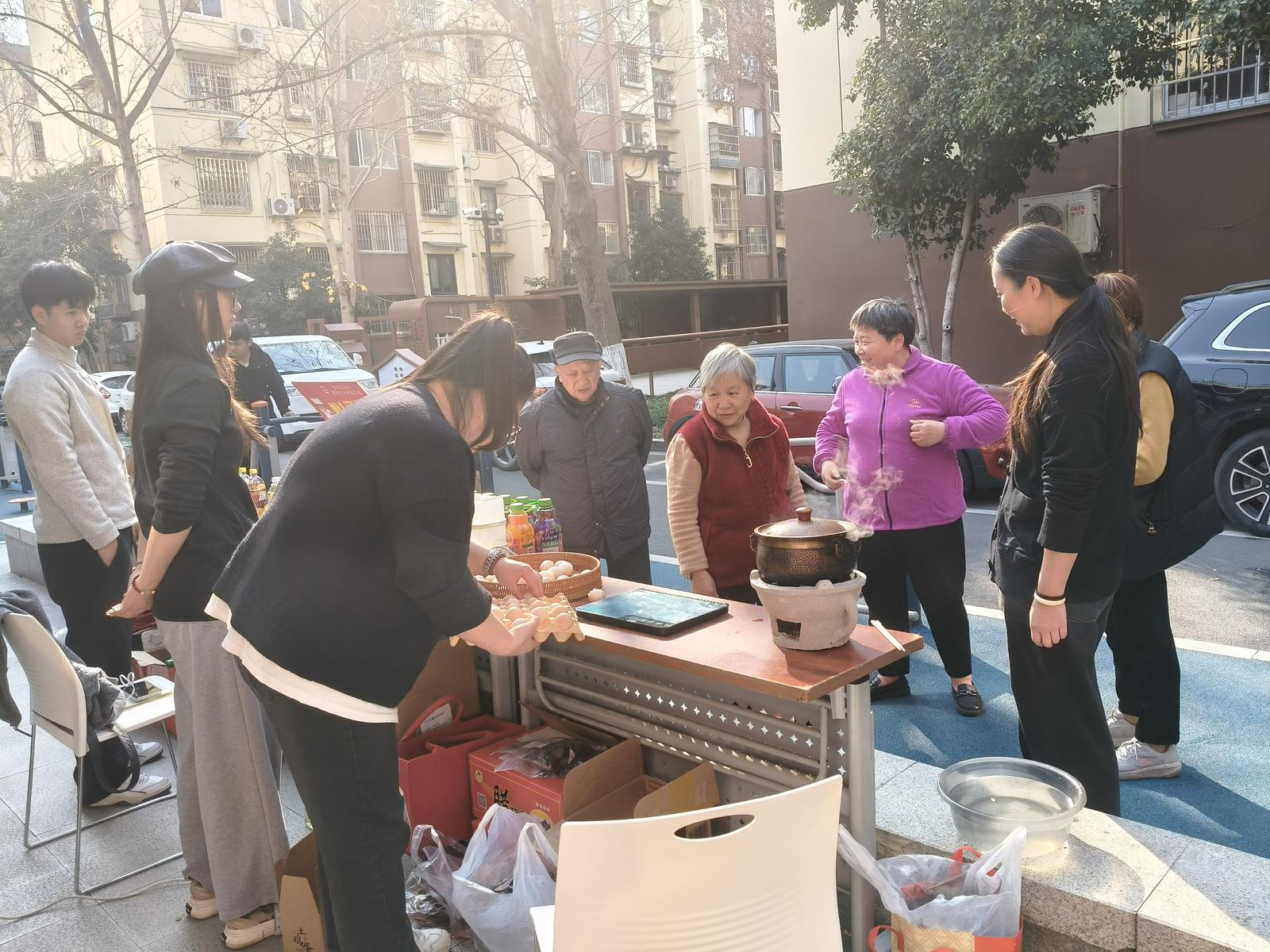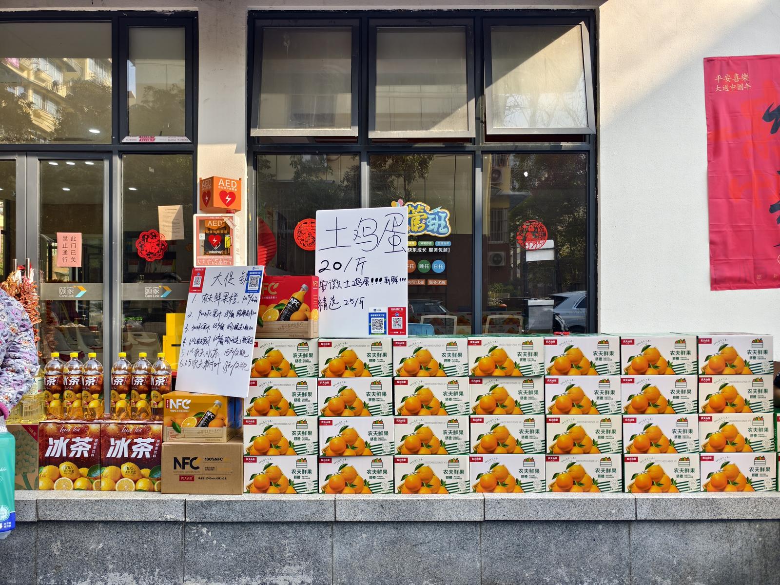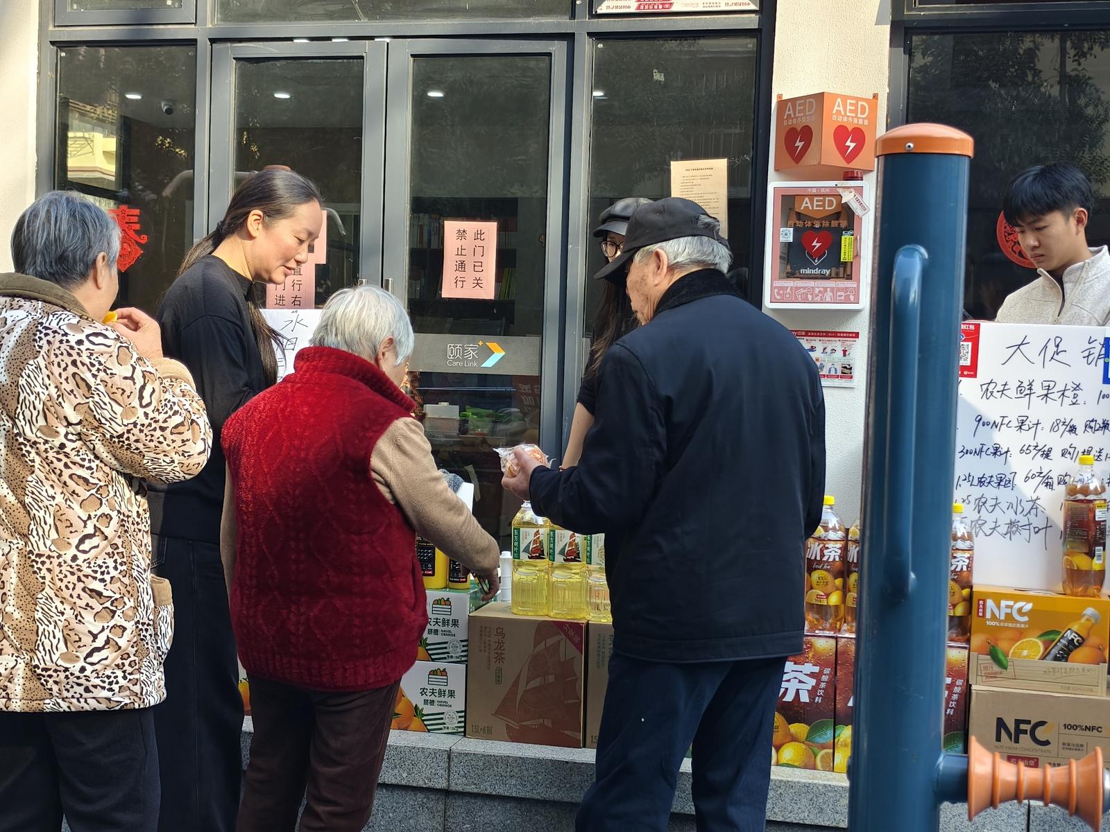 活动现场,各类农产品琳琅满目:土鸡蛋、农夫鲜果橙、NFC 果汁、冰茶、食用油等商品整齐摆放,价格实惠,吸引了不少居民驻足挑选。工作人员则化身 “摊主”,现场为居民介绍产品特点,还贴心提供了鸡蛋分装、试吃等便民服务。不少老年居民在摊位前仔细挑选,年轻居民则扫码下单,现场氛围温馨又热闹。