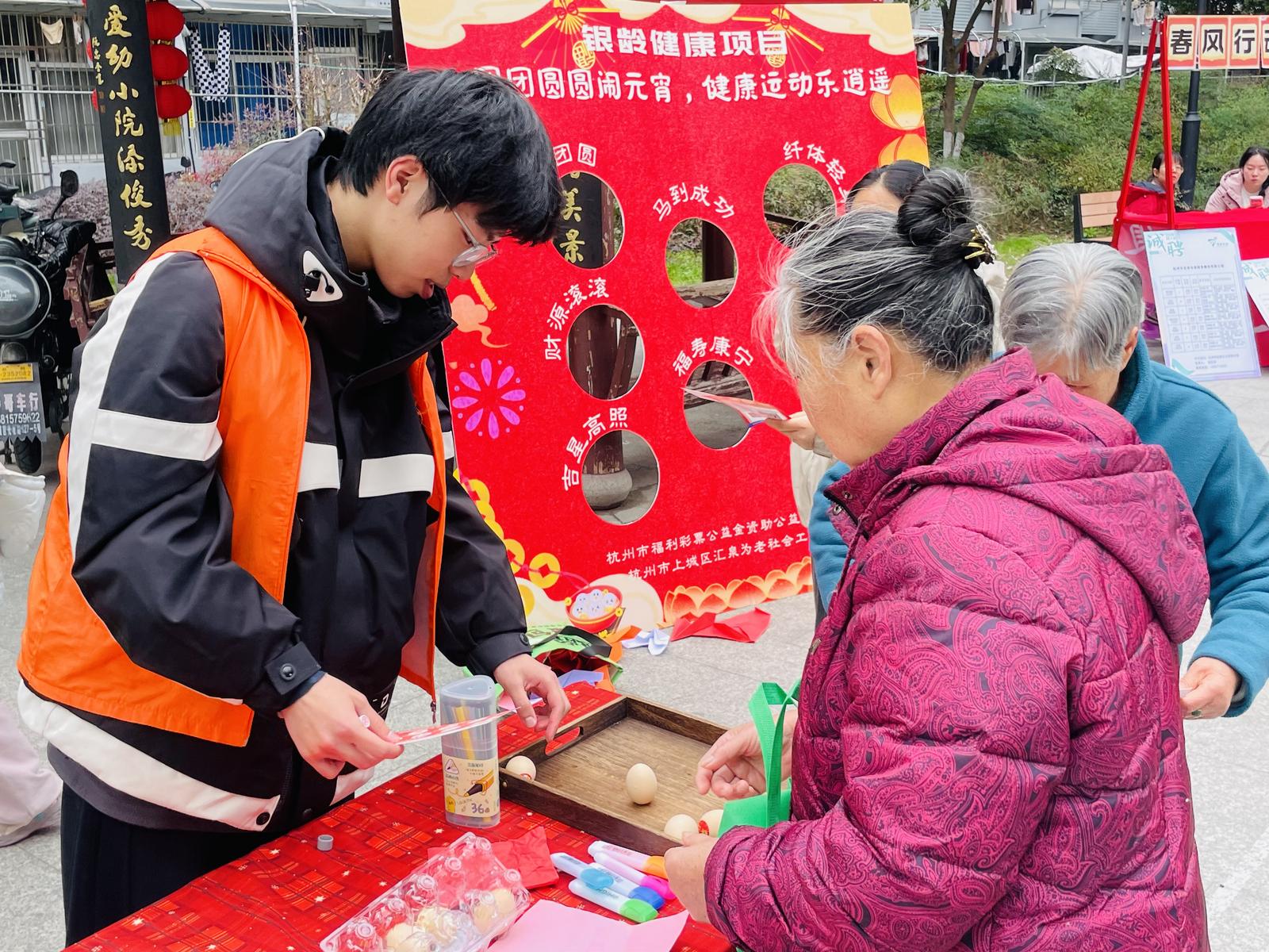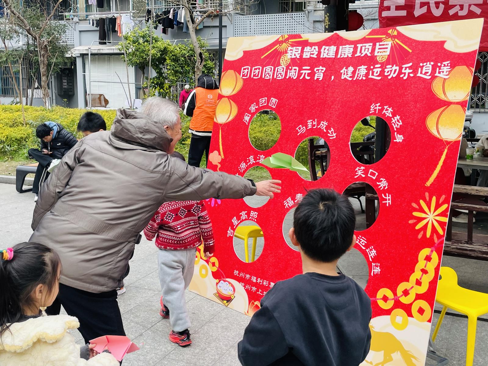 “福气启智区”的“福气大转盘”和“福圆掌心转”前,老人们转动幸运转盘,回答健康小常识,在游戏中启发了智慧,收获了知识。“妙趣猜谜区”的“圈中猜灯谜”则将传统猜灯谜与套圈游戏相结合,大家手持彩圈,瞄准谜面,既锻炼了眼手协调能力,又重温了元宵节的传统乐趣。居民张阿姨一边套圈一边笑着说:“我每年都猜灯谜,但这样套着圈猜还是头一回,又新鲜又好玩!”