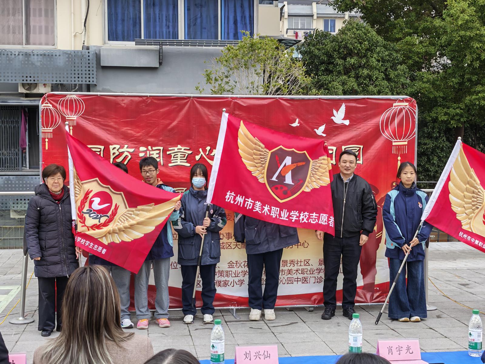 仪式环节亮点突出。景新社区与杭州市上城区天鹰军创公益服务中心现场签订党建共建协议,进一步深化校地协同与军民融合。上城区退役军人事务局、区关工委及街道领导,为杭州市中策职业学校、美术职业学校志愿者队伍授旗,全体学生志愿者庄严宣誓,承诺践行志愿精神,传承国防情怀,弘扬传统文化。