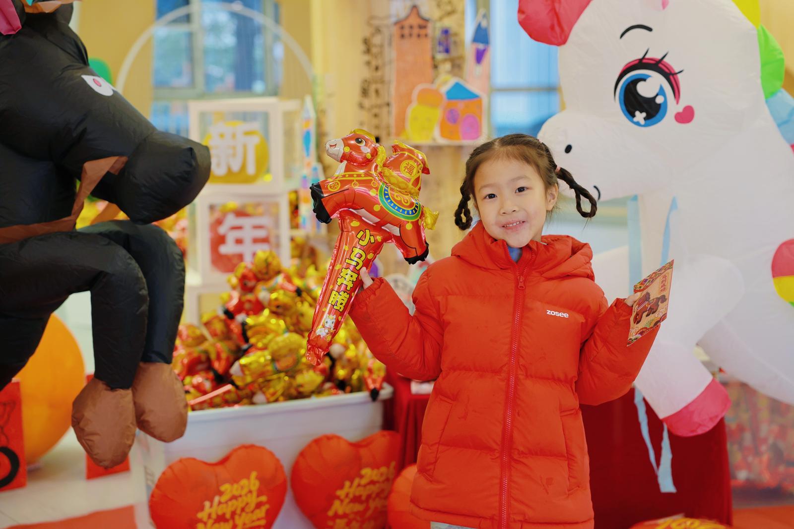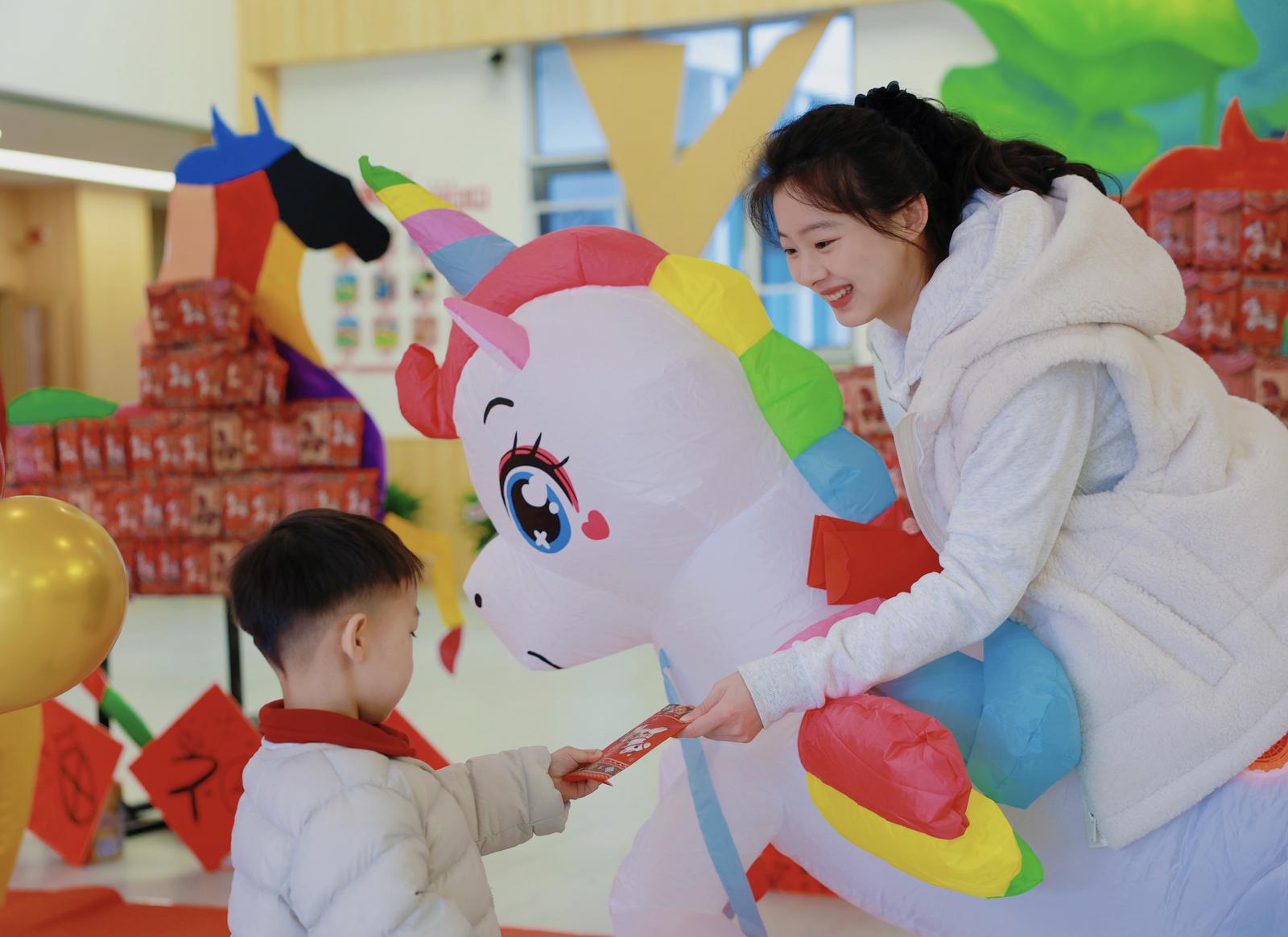 园内处处洋溢着新春氛围,卡通马装扮的老师热情迎接小朋友入园,孩子们领取福马红包、手绘小马汇成“万马奔腾”签到墙,园长为新插班生授予星星徽章,满是新春暖意。