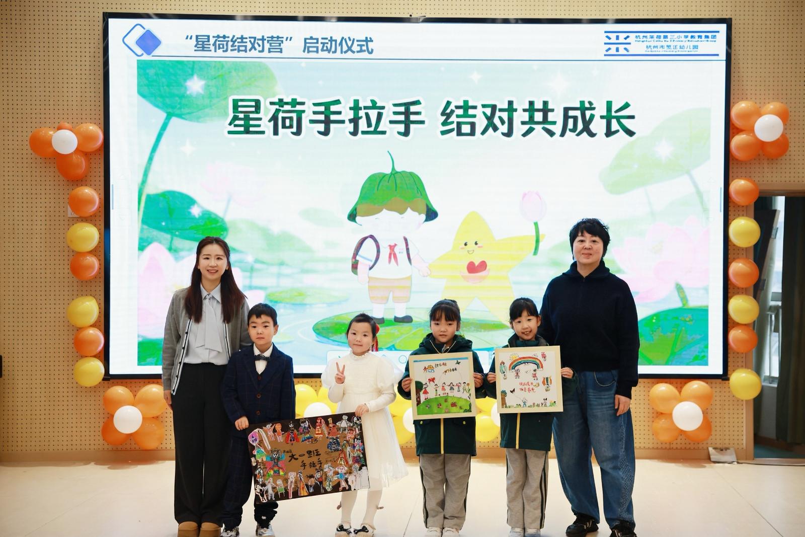 在“星荷结对营”上,杭州采荷第三小学的老师和哥哥姐姐走进幼儿园,小学老师杨老师深情寄语,为孩子们勾勒小学美好图景;幼儿园教师代表赵老师送上对孩子们的美好祝愿与成长期许。双方互赠祝福画、全家福,温暖拥抱间,跨校园的友谊悄然缔结,小学的美好模样在孩子们心中清晰定格,为后续幼小衔接系列活动筑牢情感基础。