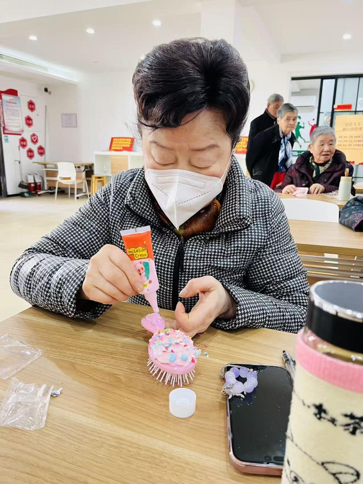 一位阿姨正专注地将粉色奶油胶挤在梳背上,再小心翼翼地贴上彩色糖粒和卡通贴片。她的眼神里满是认真,仿佛在雕琢一件珍贵的艺术品。不一会儿,一把带着梦幻色彩的“少女心”梳子就初具雏形。旁边的居民们也各显神通,有的用透明花朵装饰,有的搭配爱心亮片,每一把梳子都承载着创作者的巧思与心意。
