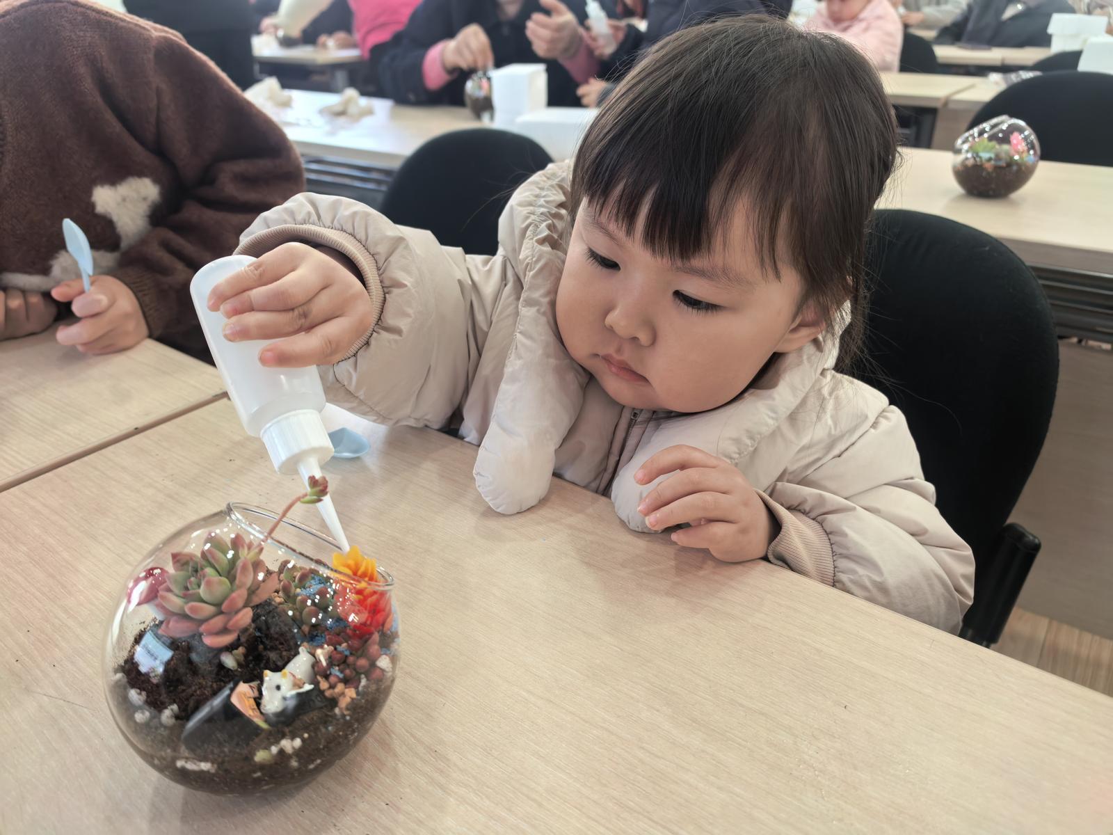 随后的盆栽DIY环节,才是真正的“重头戏”。花盆、土壤、多肉植物、小石子、卡通摆件……材料一字排开,孩子们早已跃跃欲试。在专业老师的指导下,孩子们学着填土、栽种、铺面,神情专注得像是在完成一件了不起的艺术品。孩子们发挥天马行空的想象力,一盆盆多肉、绿植在亲子协作中焕发出盎然生机,每一盆都凝聚着家庭的创意与温情。
