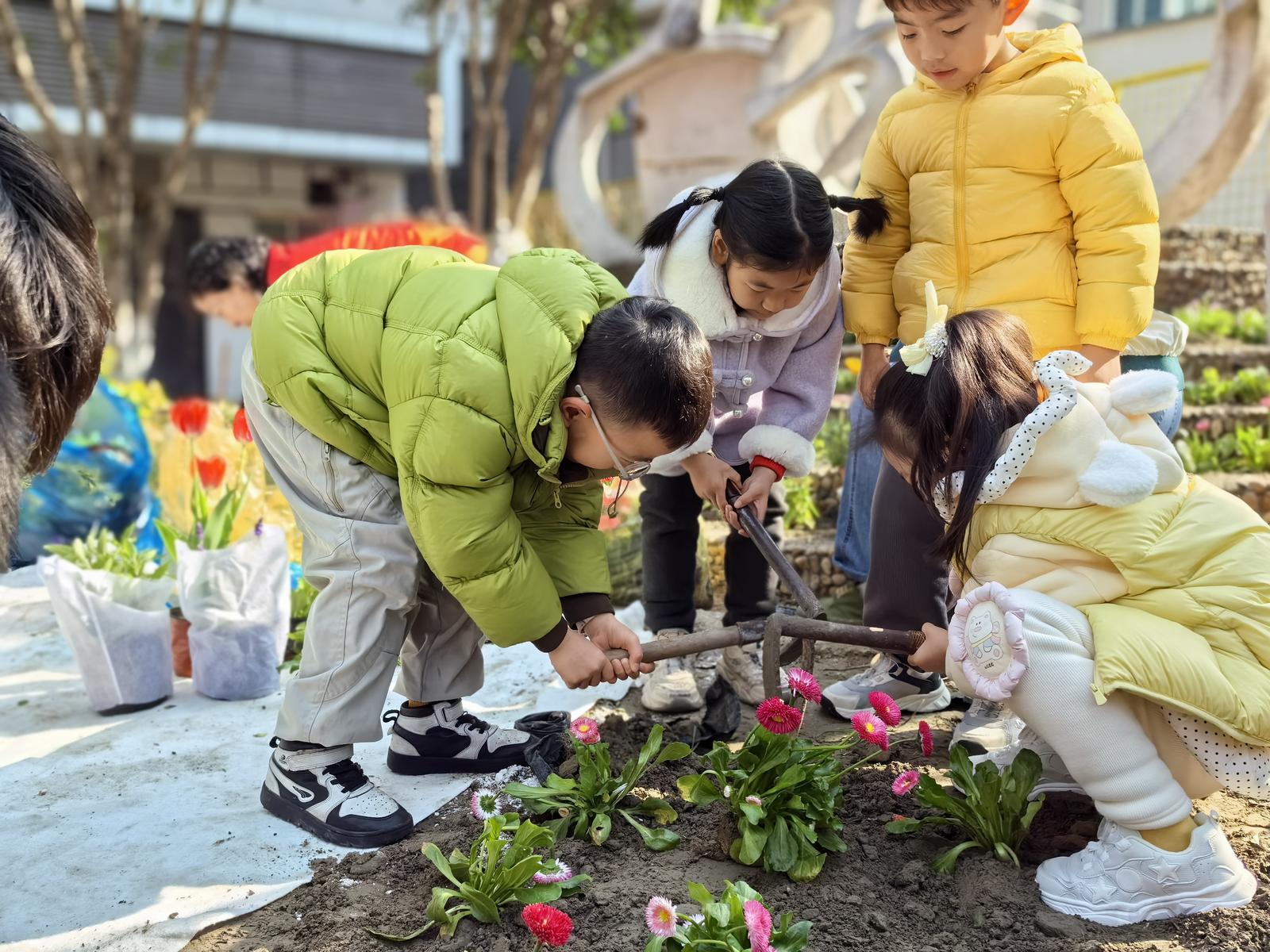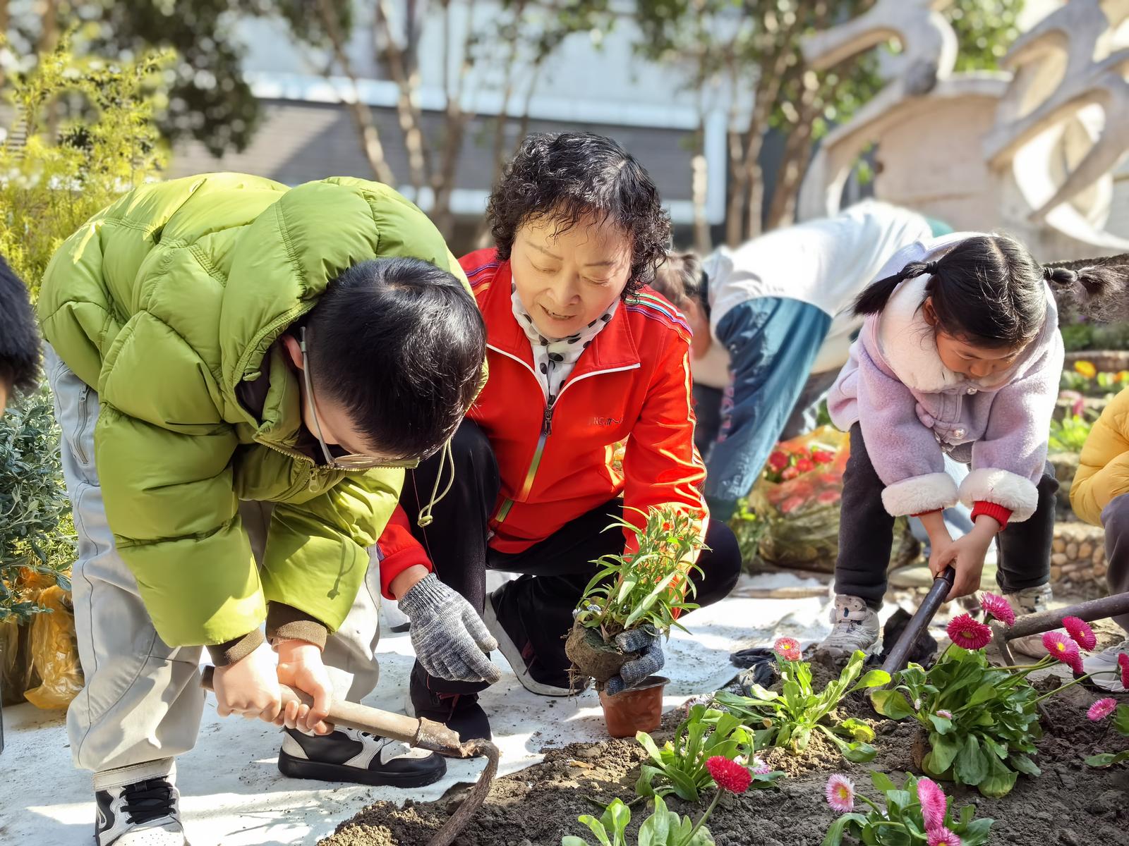 活动现场,参与人员分工协作,有的挥锹挖坑,有的扶苗培土,有的提水浇灌。社区花友会的成员们更是发挥专业特长,一边示范种植技巧,一边耐心指导身旁的小朋友:“小苗要扶正,土要轻轻压实,这样根才能扎得稳。”孩子们睁大好奇的眼睛,小心翼翼地将一株株花苗植入土中,稚嫩的脸上洋溢着劳动的喜悦。