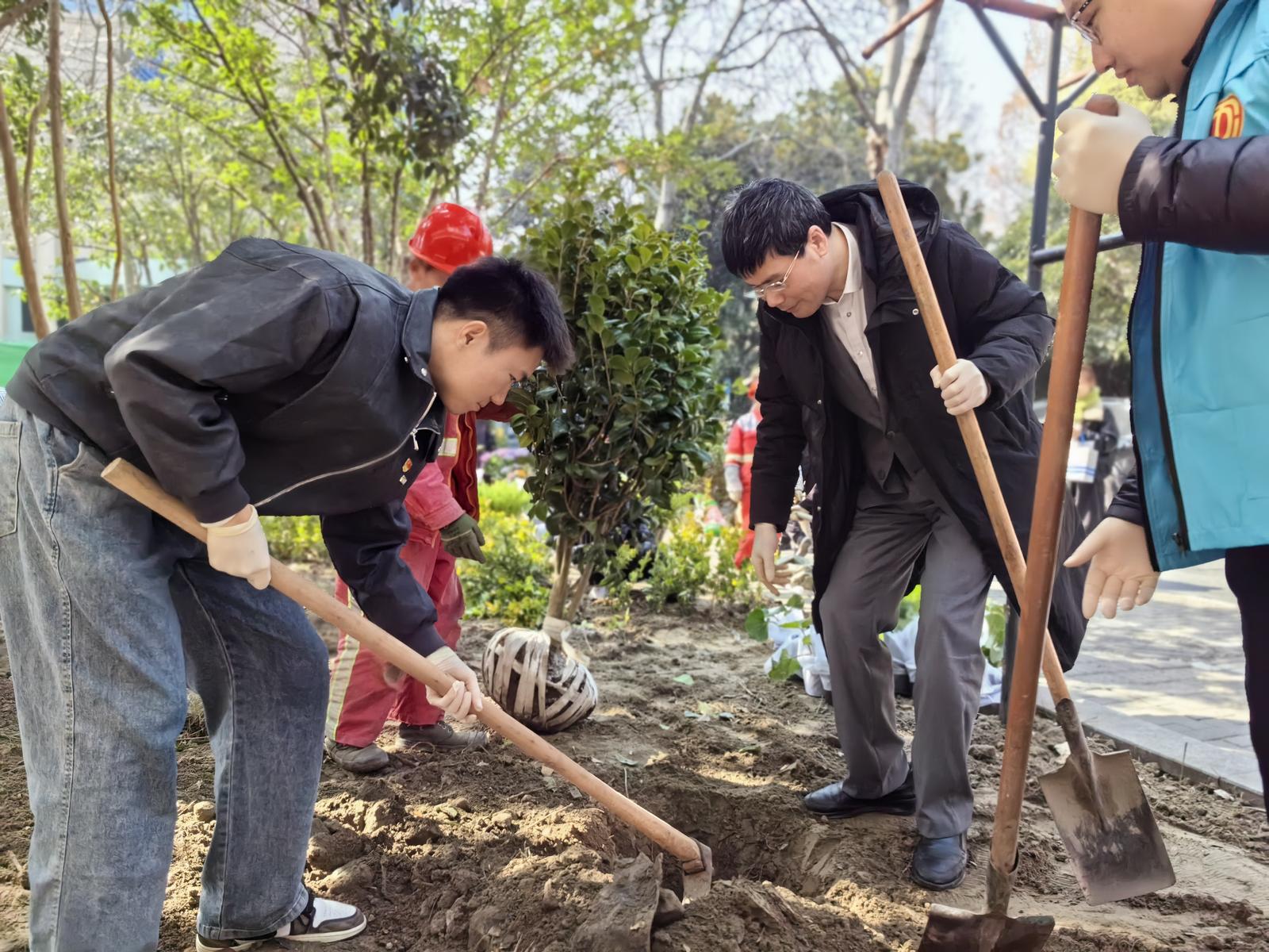 值得一提的是,本次活动还吸引了一批特殊的参与者——来自辖区共建企业的党员和青年团员们。据介绍,几天前,他们在微信公众号上看到植树节活动的宣传预告后,便主动联系社区要求加入。“看到社区要搞绿化活动,我们党员当然要带头参与。”党员代表小倪笑着说道。青年团员几人一组默契配合,搬运苗木、挥锹培土,他们的加入,展现了新时代青年服务社区、奉献社会的责任与担当。