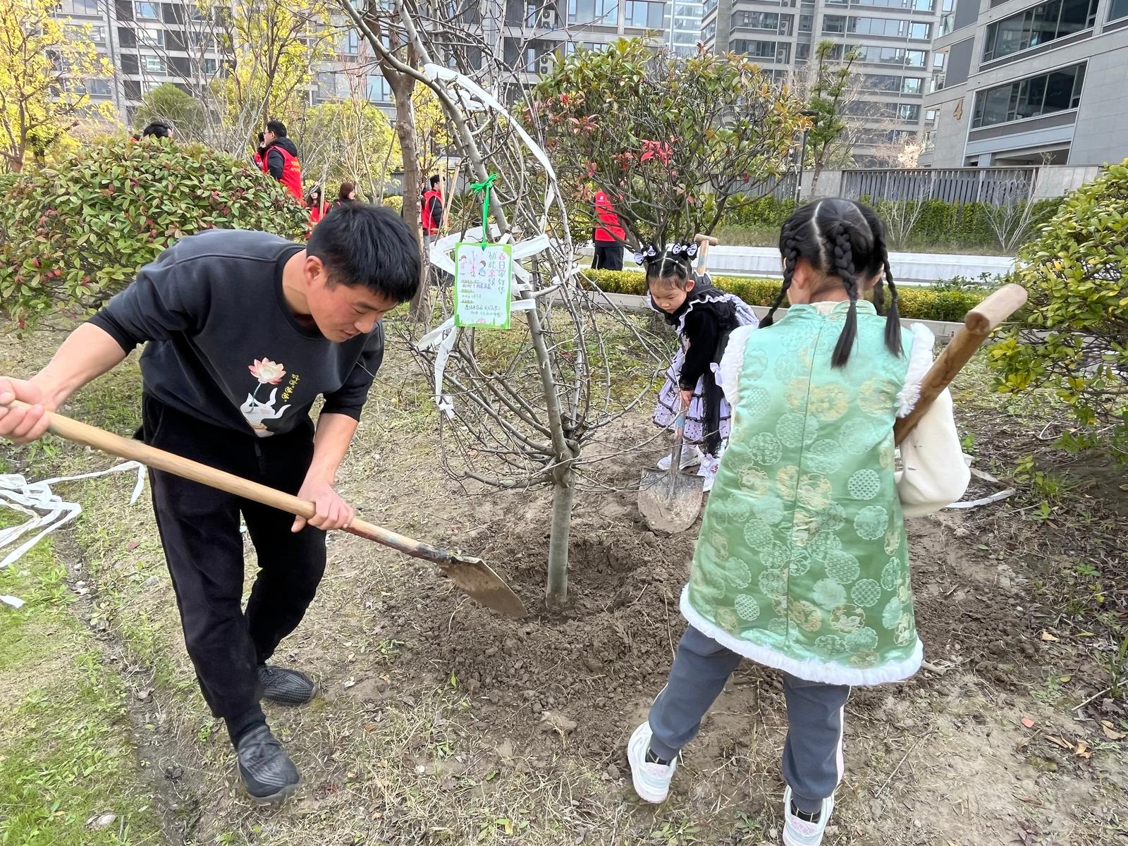 活动现场,原本空旷的绿化带变身成了热火朝天的义务植树场。来自社区内的亲子家庭与企业职工家庭全家齐上阵,大家分工明确、配合默契。“大手”握紧铁锹奋力铲土,“小手”扶正苗木细心填坑,再拎起水桶为新绿“解渴”,一派繁忙而温馨的景象。忙碌的身影交织在江风拂过的绿岸边,而一棵棵象征着希望的树苗则在众人的守护下迎风挺立。