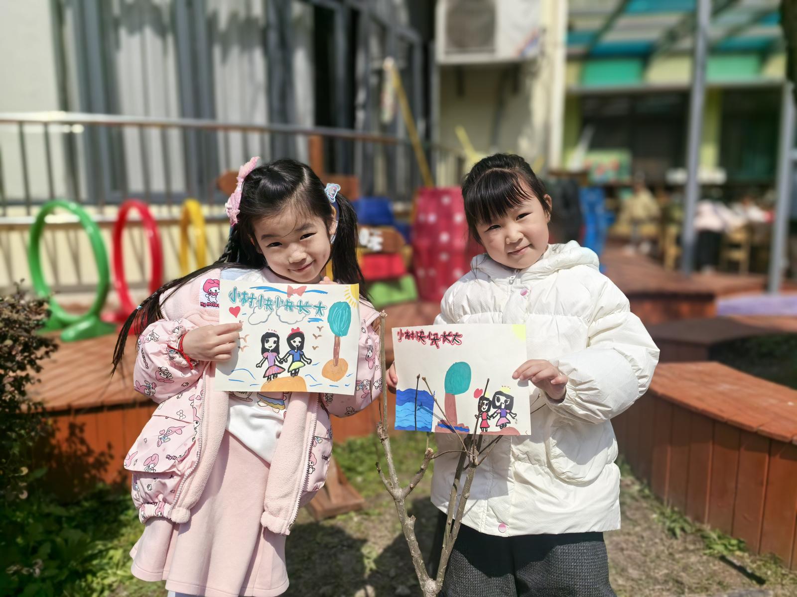 大班的陈艺琳小朋友指着刚种下的树苗,奶声奶气地告诉我们:“老师说小树可以给我们带来新鲜的空气,我要经常来看它,给它浇水,它就不会口渴了。”程景怡小朋友则拿着自己的画作骄傲地说:“我画的是这棵小树长大了,结满了无花果,我要和所有小朋友还有老师一起吃!”