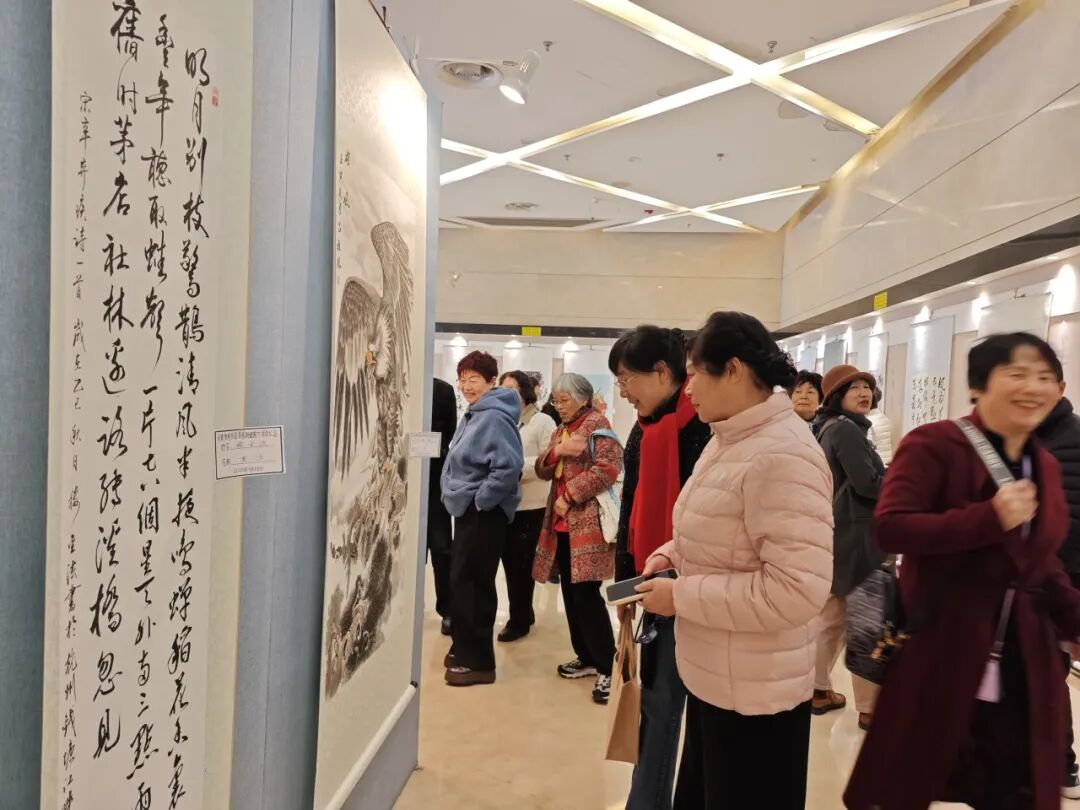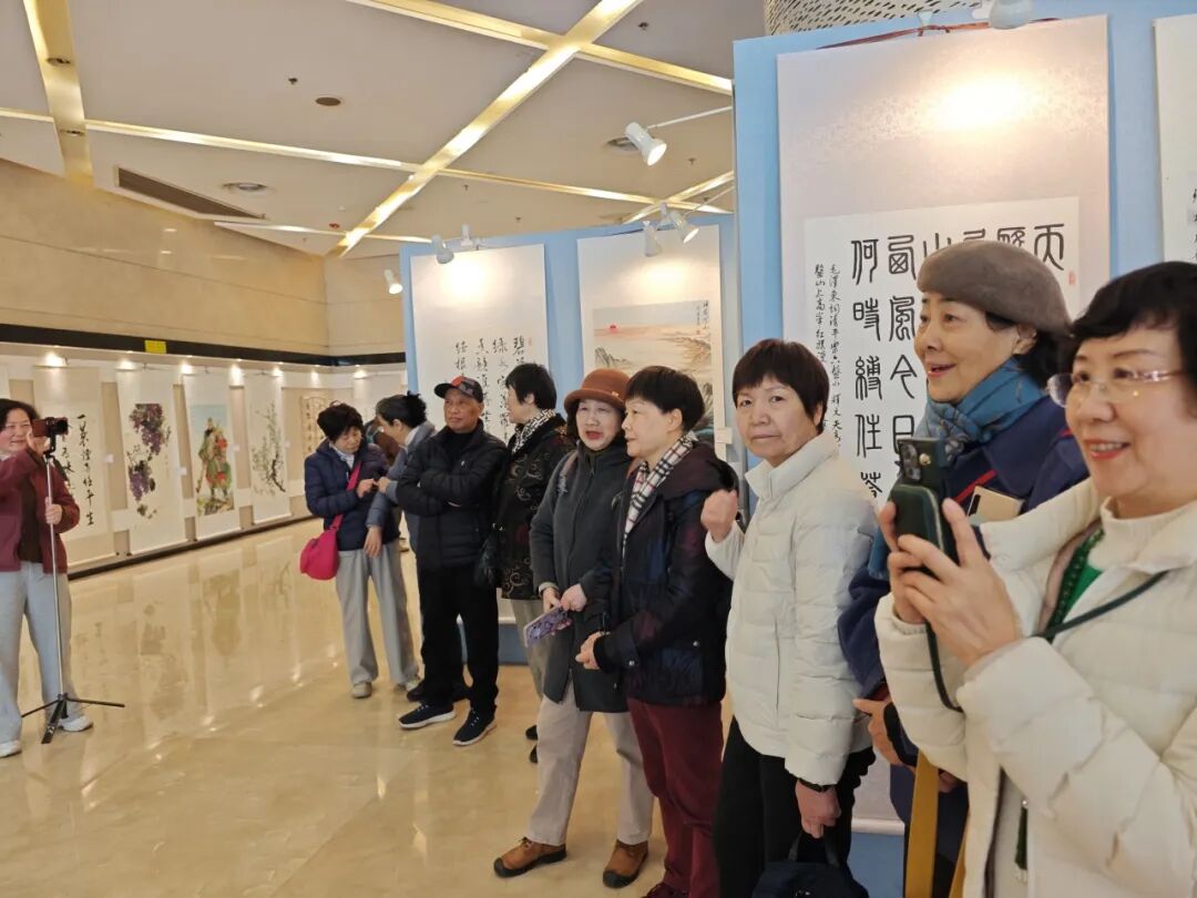 步入展厅,71幅书画作品错落有致、墨韵盎然。书法作品或刚劲端庄、或飘逸灵动,绘画作品山水写意、花鸟传神,每一幅都饱含着老年创作者对生活的热爱、对艺术的追求。现场暖意融融,书画社的老年居民们围聚在作品前,时而驻足凝视、细细品鉴,时而俯身交流、切磋笔法,从笔墨技巧谈到创作构思,从学习心得聊到生活乐趣,言语间满是志同道合的欢喜与满足。大家互相点评、互相鼓励,在交流研讨中共同进步,在笔墨书香中尽享晚年生活的充实与快乐。