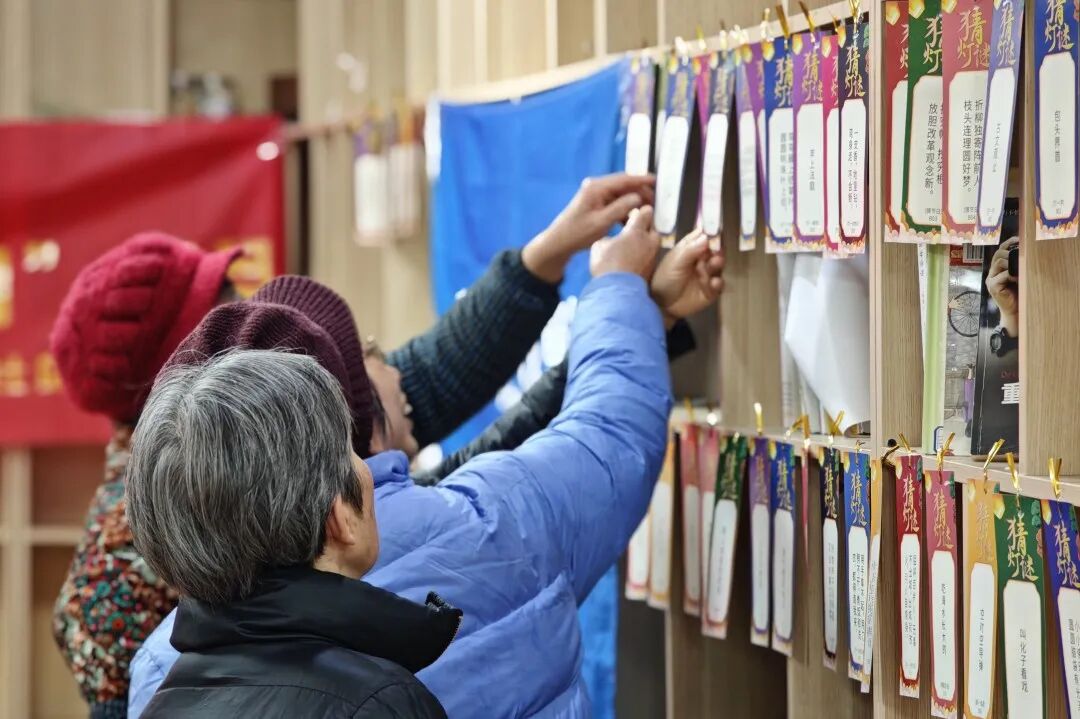 活动现场,社区准备了各类谜语,居民们三五成群,现场气氛热烈而欢乐。另一边,制作糖葫芦的摊位前已经排起了长队,还设有成语闯关、隔空取物、踩盲盒等趣味游戏,吸引了不少小朋友参与。便民服务摊位烟火气浓厚,有免费清洗眼镜服务、量血压服务、业务咨询服务等,社区借此活动机会,向居民发送“扫黄打非”、访电信诈骗宣传册,提高大家安全意识。