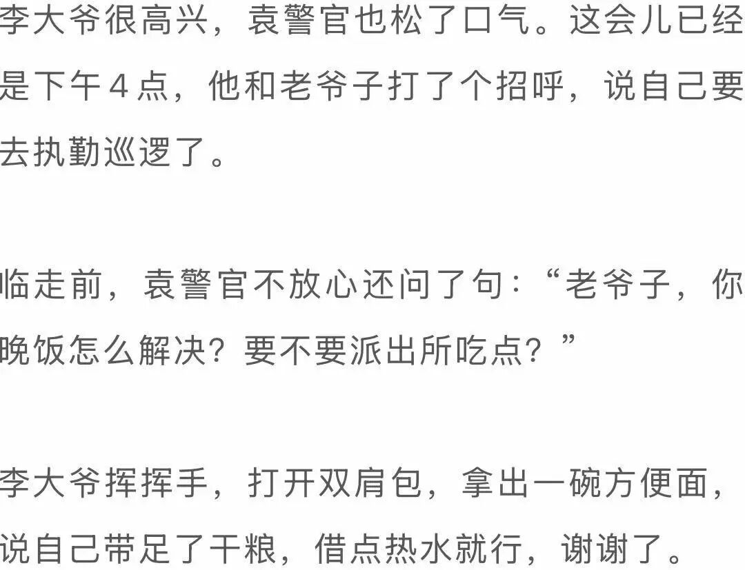 袁警官问小李,你们晚上住哪儿?小李说,自己在附近定了酒店,带爷爷过去。袁警官说,我们开车送你们。