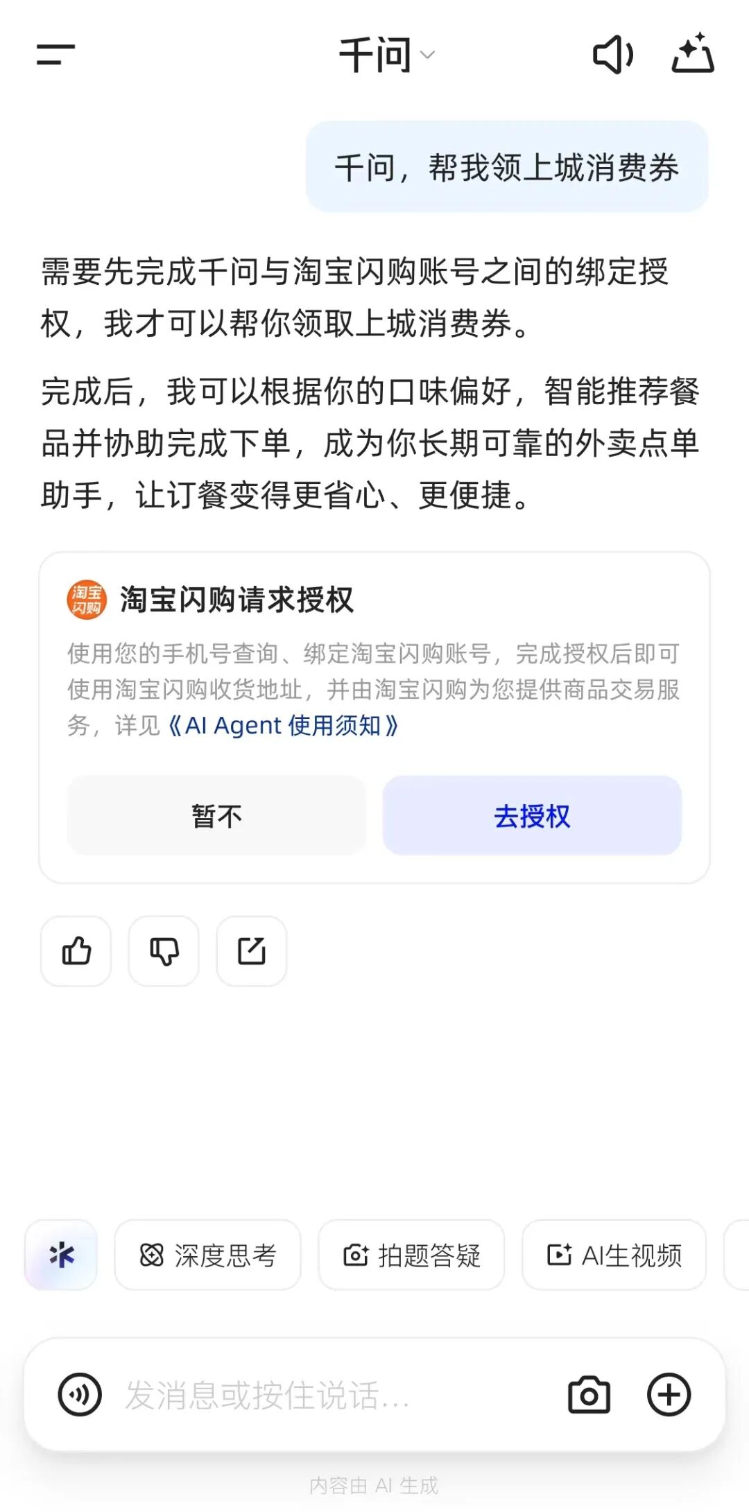 下载千问App,并授权淘宝闪购账号关联,当前定位且收货地址在杭州市的用户。