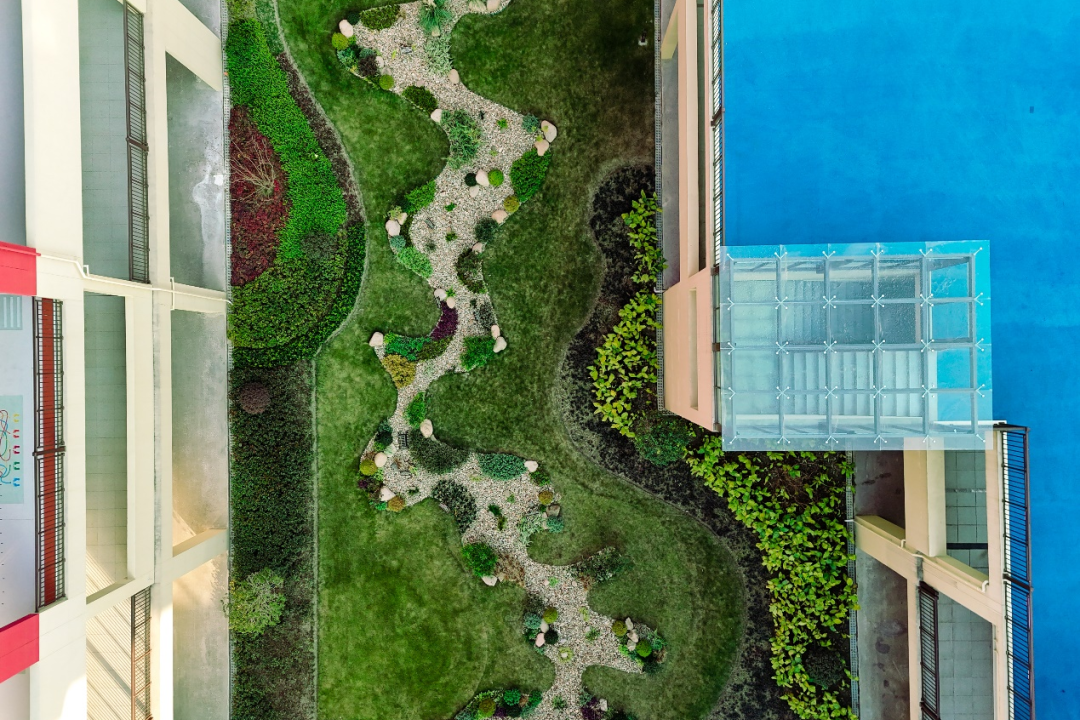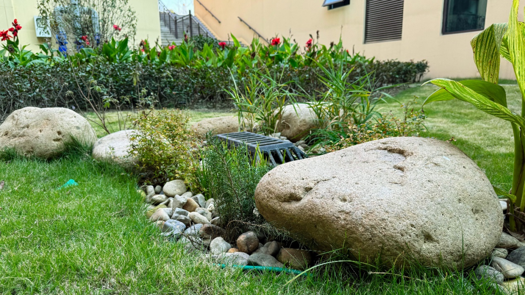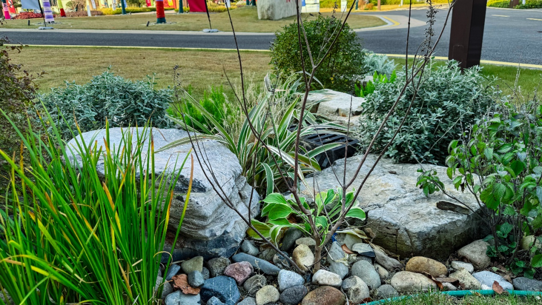 项目还将花境设计理念融入了海绵建设,让海绵设施成为校园里可观可赏的生态景观——在下沉式绿地低点附近,精选耐淹耐旱植物搭配种植;在道路边界处采用缓坡设计,搭配平侧石,让径流组织更加顺畅;溢流井等设施巧妙“藏”于植物和景石之间,远观浑然一体。龟甲冬青、金叶女贞、石菖蒲、迷迭香、水果兰、花叶山菅兰、天门冬、美人蕉等植物错落有致,白色鹅卵石铺就的旱溪在绿地间蜿蜒。
