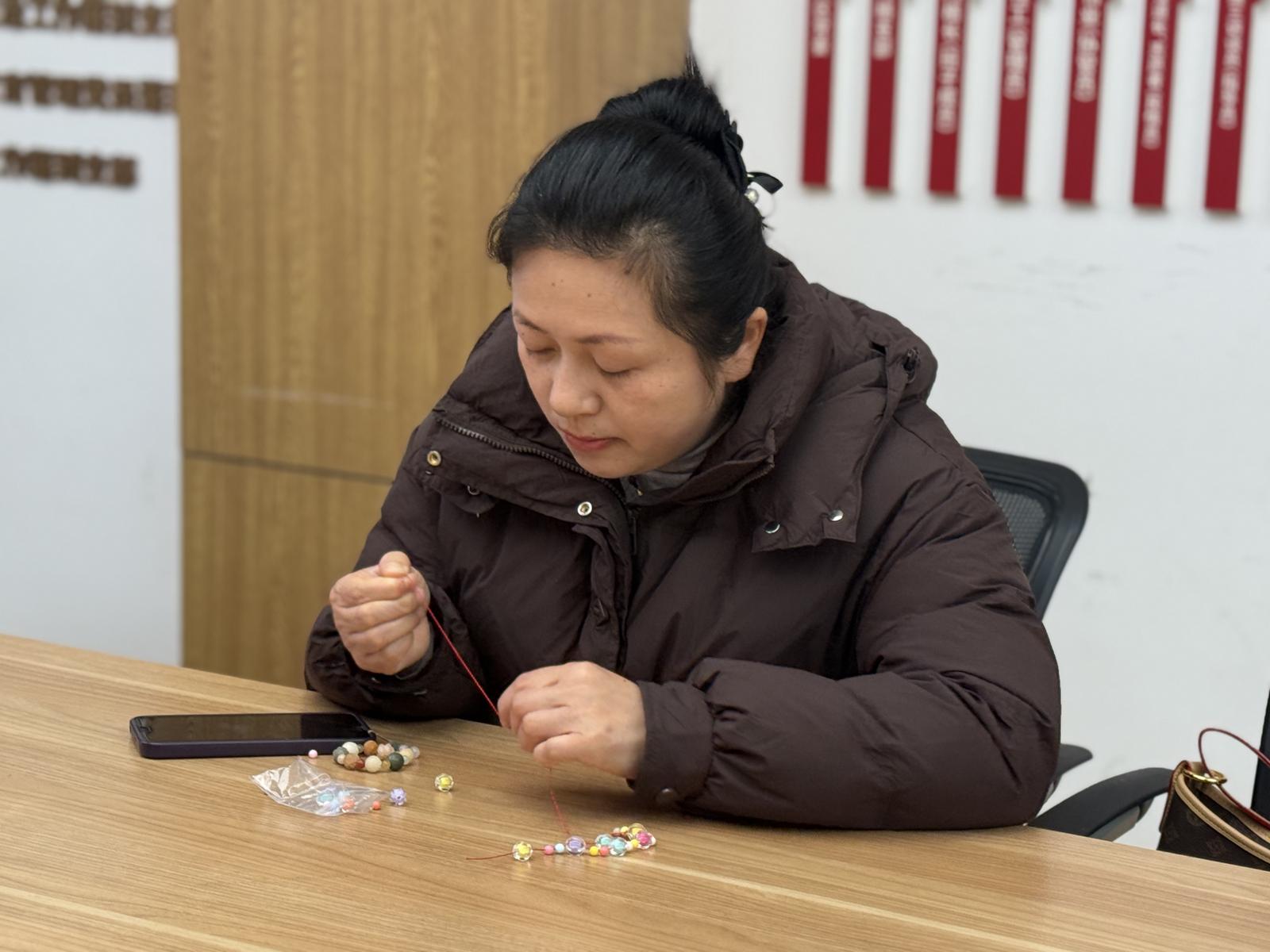 走进活动现场,扑面而来的是满溢的活力:五颜六色的彩珠整齐铺在长桌上,一眼望去就让人心情明媚。社区特意邀请的手工老师,手把手带着大家入门:“穿线要慢一点,打结记得拉紧,配色不用拘着,自己喜欢最关键!”