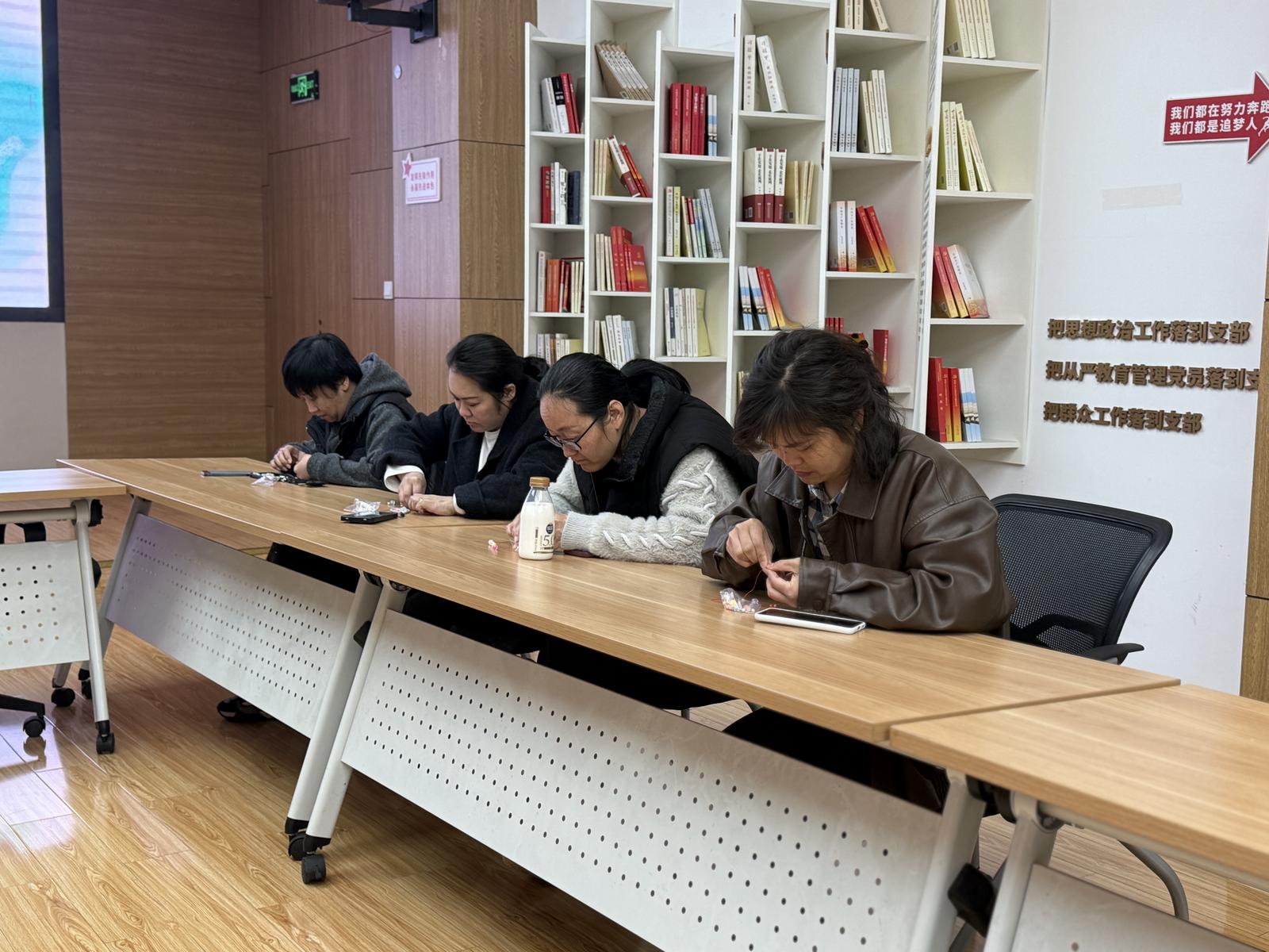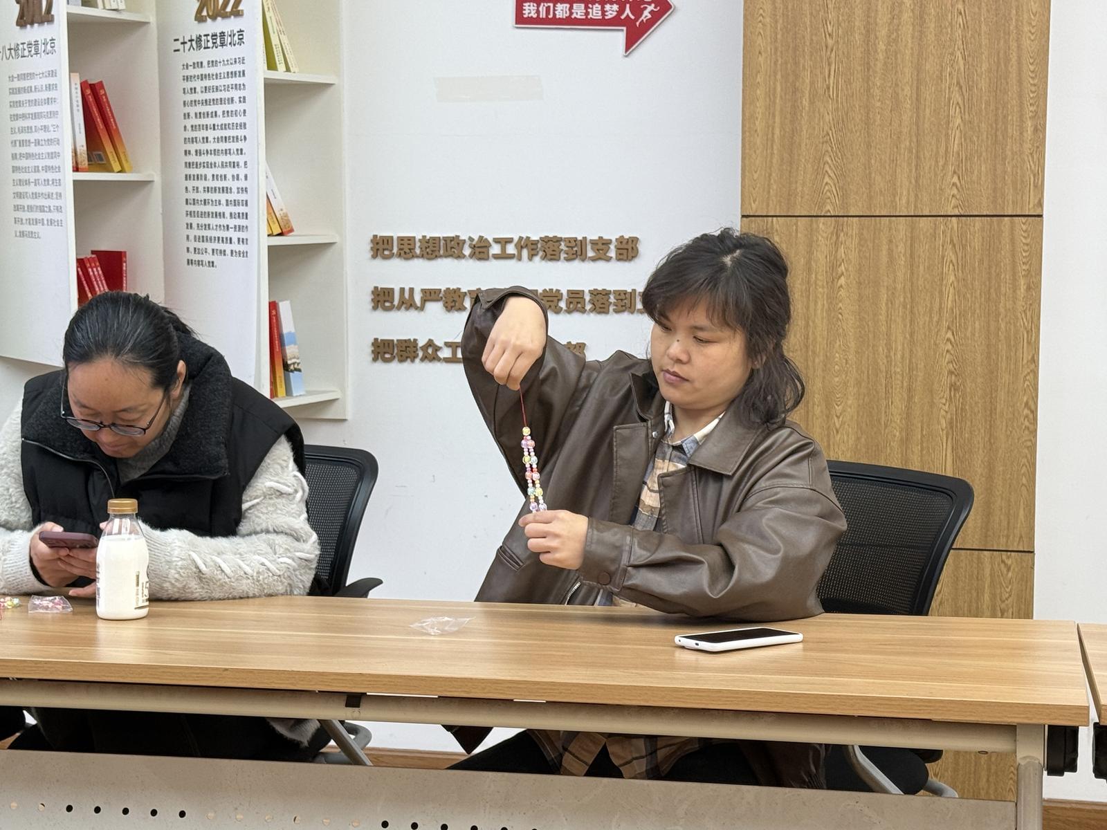年轻人围坐在一起,一边挑选心仪的珠子,一边你一言我一语地热聊:“粉色配黄色也太亮眼了吧”“帮我看看这个结打得对不对呀”,欢声笑语瞬间填满了整个房间。原本零散的珠子,在大家的指尖渐渐蜕变成独一无二的手机链——有人挂在手机上试戴,有人拍照分享给朋友,脸上洋溢着满满的成就感。