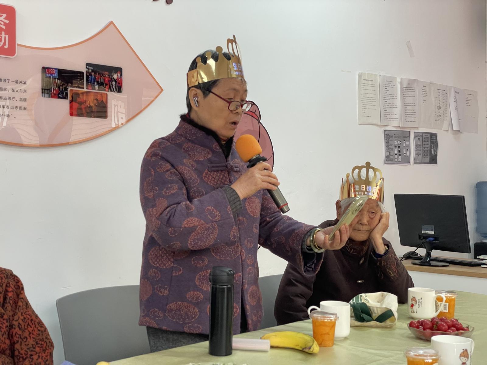 活动现场布置简洁温馨,欢声笑语不断,处处洋溢着家的温暖。社区器乐队早早到场,伴随着悠扬的旋律,队员们奏响《生日快乐歌》,熟悉的曲调萦绕耳畔,志愿者们主动上前,与老人们手拉手跟着节奏哼唱、互动,真挚的祝福化作动听的歌声,温暖了每一位寿星的心房。现场氛围愈发浓厚,家住社区的朱阿姨被这份温情感染,主动登台献唱《我爱你中国》,歌声铿锵有力、荡气回肠,唱出了对祖国的热爱与对幸福生活的赞美,赢得在场人员阵阵热烈的掌声,也将活动气氛推向高潮。