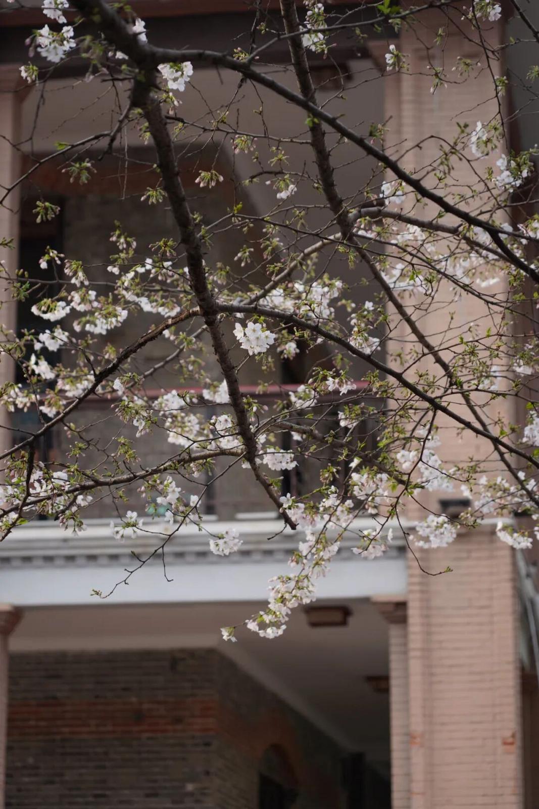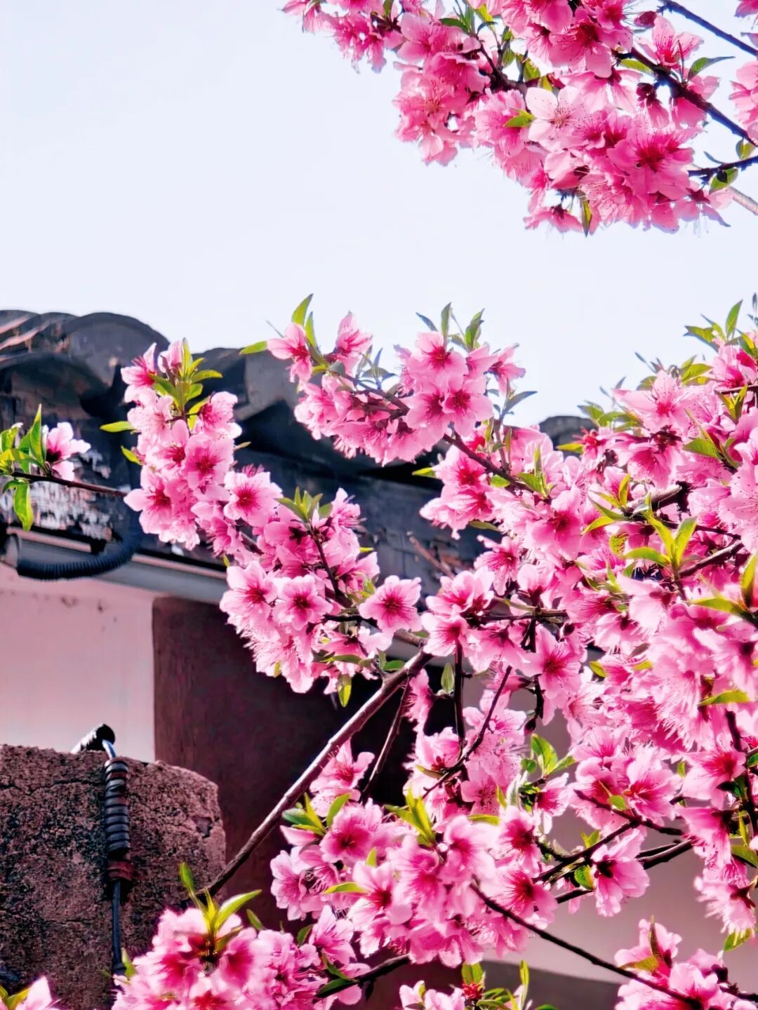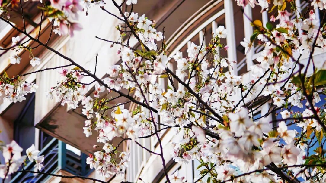国医馆的白墙黛瓦间,粉樱缀满枝桠