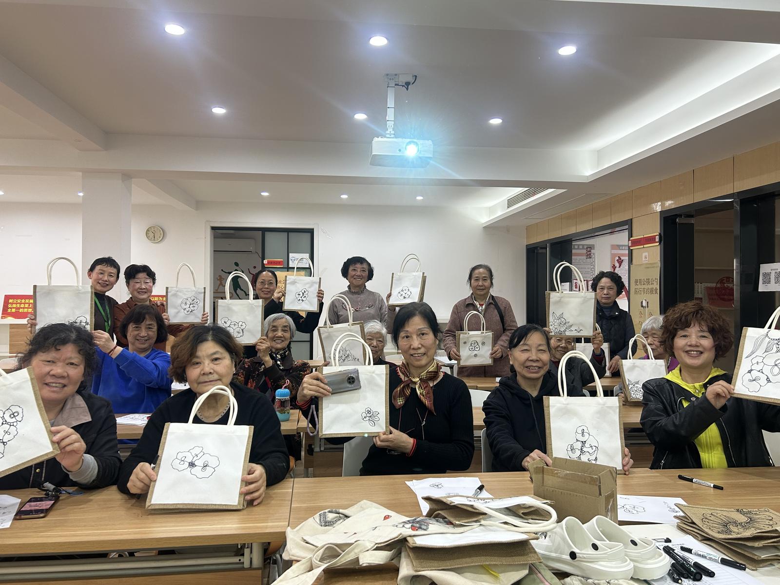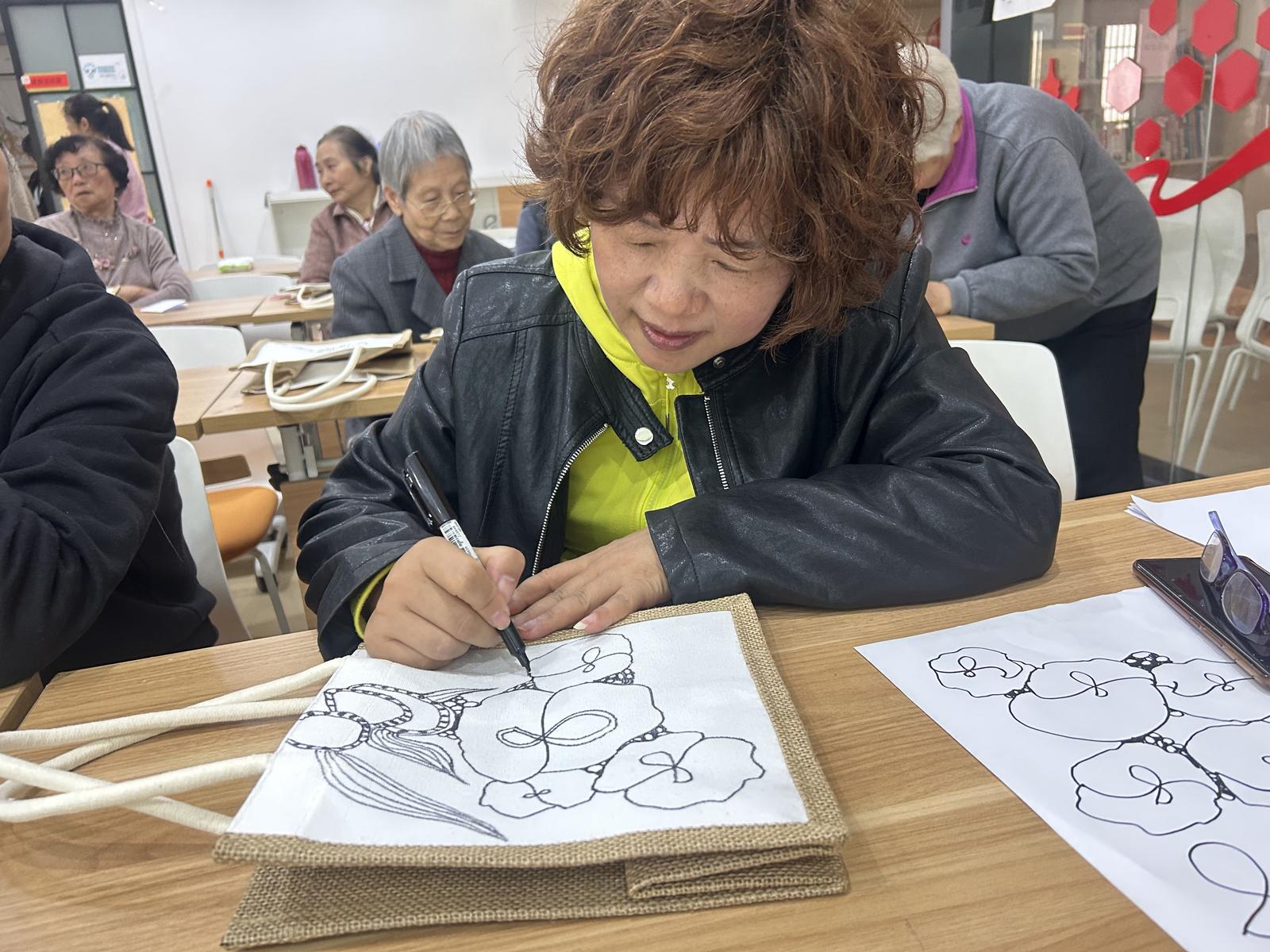 实操环节,大家将目光投向朴素的手工包,在包老师的手把手指导下,将禅绕技巧与个人创意相融。有人勾勒出圆润的花瓣纹样,有人编织出缠绕的几何线条,墨色在布面缓缓晕开,原本单调的袋子渐渐被赋予了独特的生命力。活动室里,只有笔尖摩挲布料的沙沙声,老人们低头创作的身影,成了最动人的文明图景。当最后一笔落下,每位居民都捧起了专属的禅绕画手工包,眉眼间满是成就感与笑意。