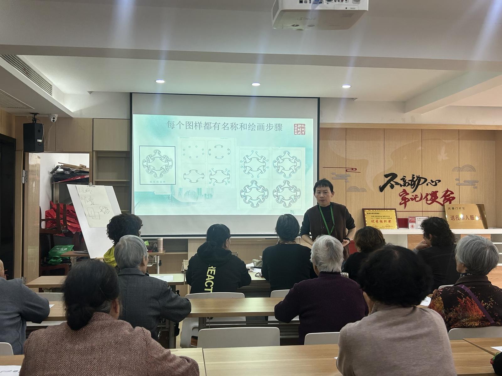 活动伊始,包老师向大家娓娓道来禅绕画的艺术内核:“无对错、无预期,在重复的线条与纹样中,感受内心的平静与专注。”她一边展示经典图样,一边拆解绘制步骤,从基础的点线组合到复杂的对称纹样,细致的讲解让原本陌生的艺术变得亲切可感。居民们听得入神,笔尖在草稿纸上轻轻试探,渐渐找到了禅绕画的韵律。