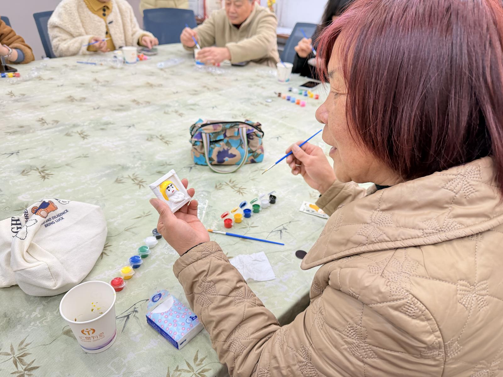 活动现场,社区工作人员提前准备好了石膏胚体、环保颜料、画笔等丰富的手工材料。在轻松愉悦的氛围中,居民们围坐在一起,充分发挥自己的想象力和创造力,用画笔为纯白的石膏冰箱贴勾勒轮廓、填充色彩。大家一边交流创作思路,一边互相帮忙配色、调整细节,欢声笑语不断。从可爱的卡通形象到精致的装饰纹样,每一个冰箱贴都承载着居民们的巧思与心意,大家在动手创作中收获了满满的成就感。