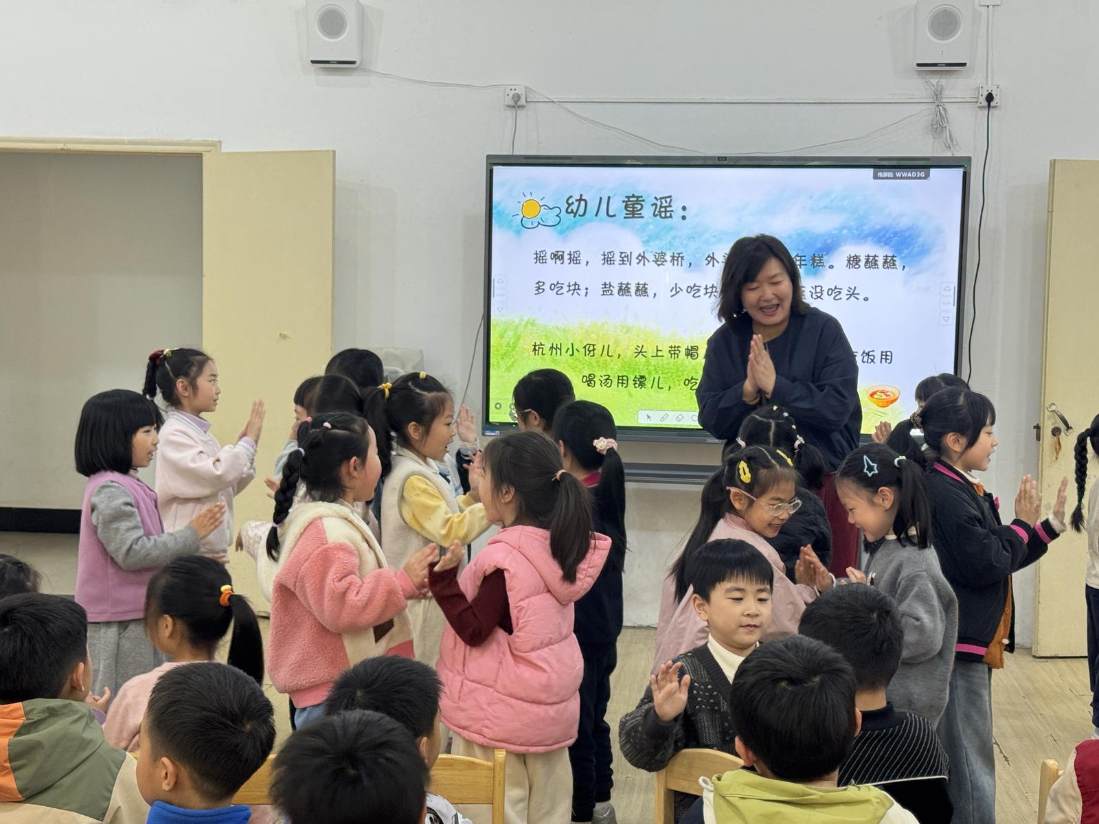“摇啊摇,摇到外婆桥,外婆请我吃年糕……”童谣教学是本次活动的核心环节,倪艾彤老师带领孩子们学唱经典杭州话童谣,边教边互动,将趣味游戏融入教学全过程,让孩子们在轻松愉悦的氛围中感受乡音魅力。教学中,孩子们分组轮流念诵童谣,认真跟读、踊跃展示,稚嫩的方言童谣声回荡在教室的每个角落,每个孩子都沉浸在学说方言、念诵童谣的乐趣中。不少孩子主动举手上台,自信地展示所学内容,眼神里满是认真与热情,充分展现出对杭州方言的浓厚兴趣。